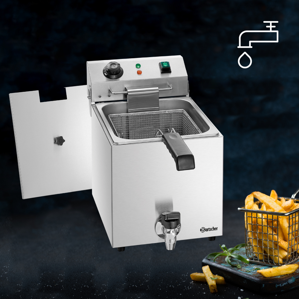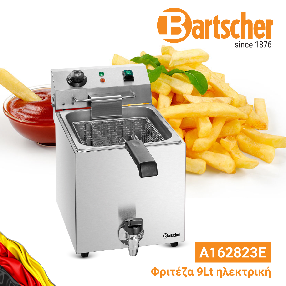 Διαστάσεις 300x530x385(h)mm Διαστάσεις κάδου 240x300x200(h)mm Διαστάσεις καλαθιού 210x220x120(h)mm Χωρητικότητα κάδου 9 lt Θερμοκρασία ρυθμιζόμενη 50 - 190οC Ισχύς 3,3 ΚWatt, 230V / 50-60Hz Βάρος 6,2 kg Κωδικός Προϊόντος A162823E Κατάλληλη για λάδι τηγανίσματος και μαγειρικό λίπος σε πλάκα Inox περίβλημα και καπάκι Θερμοστάτης ασφαλείας (για υπερθέρμανση) Συμπεριλαμβάνονται 1 καλάθι (κωδ:162827) & 1 καπάκι.