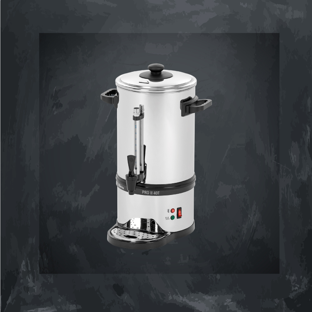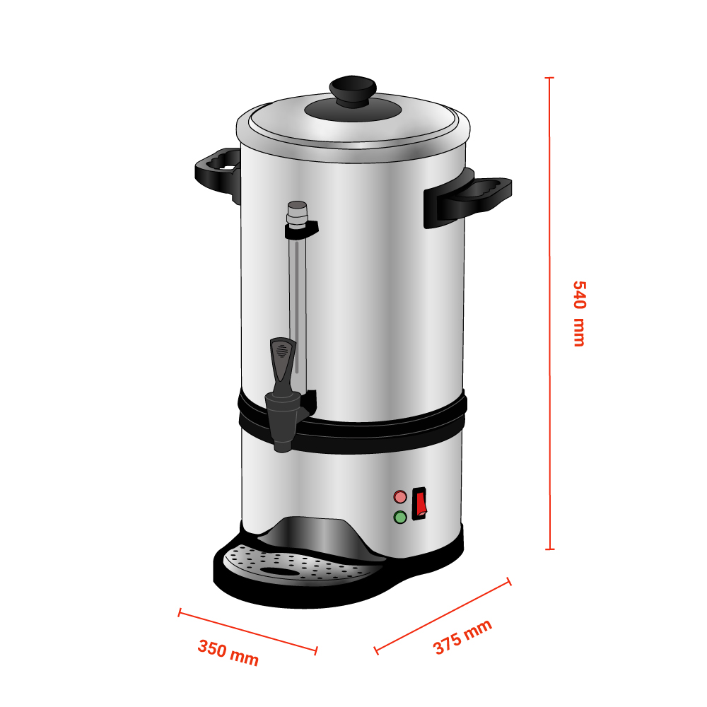'Διαστάσεις 350x375x540(h)mm Ισχύς 1.45 KWatt, 230V / 50-60Hz Χωρητικότητα 13.2 lt min / max φλυτζάνια καφέ 40 (6 lt) / 90-100 (13.2 lt) Χρόνος ετοιμασίας 100 φλυτζανιών 55'' Βάρος 4,6 kg Κωδικός προϊόντος A190198 Ξεχωριστά κυκλώματα για παρασκευή καφέ / συντήρηση ήδη έτοιμου καφέ Ένδειξη πληρότητας και αφαλάτωσης Inox περίβλημα, βάση και κάλυμμα από πλαστικό Η μηχανή καφέ μπορεί να χρησιμοποιηθεί και χωρίς φίλτρο!!'