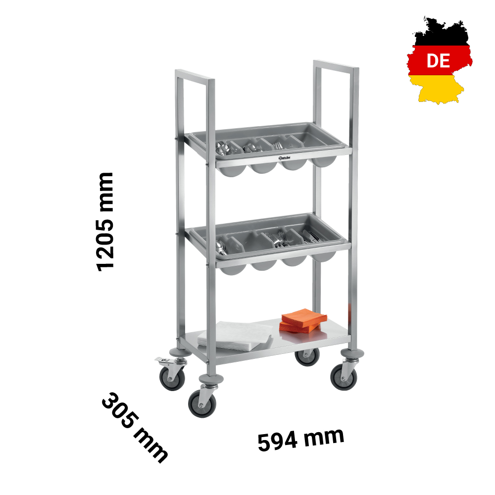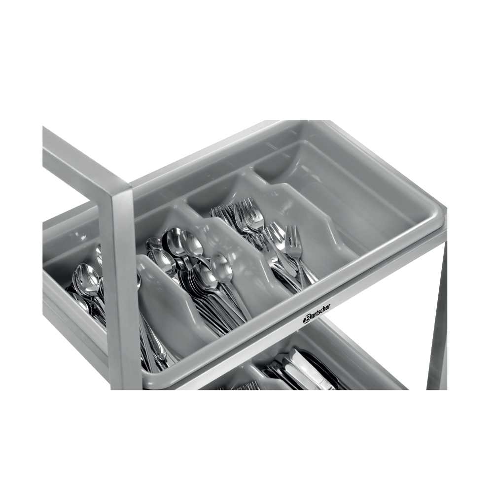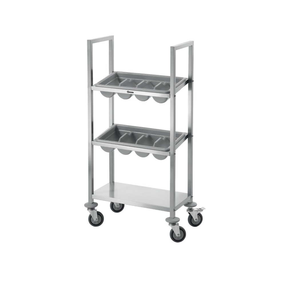 Καρότσι μεταφοράς για μαχαιροπίρουνα με 3 επίπεδα (TBST200) , Bartscher Γερμανίας. Το καρότσι για μαχαιροπίρουνα διευκολύνει τη διαδικασία εργασίας σε διάφορους τομείς. Μικρών διαστάσεων και με καλή ταξινόμηση στην αποθήκευση, πρακτικό και φιλικό για τον χρήστη στον τομέα της εξυπηρέτησης. Τα τραπέζια μπορούν να καλυφθούν, αλλά και να τακτοποιηθούν πιο γρήγορα και πιο εύκολα με το φορητό καρότσι μεταφοράς μαχαιροπίρουνων.
