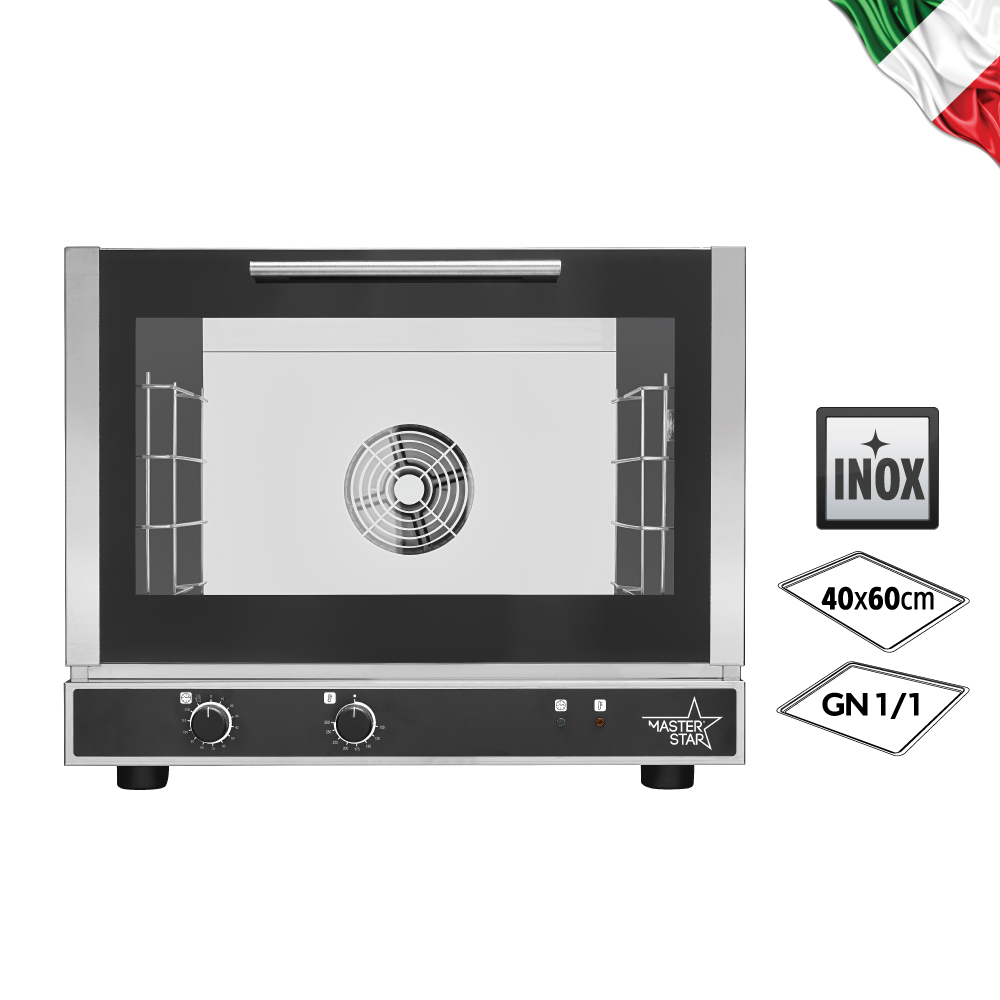 Διαστάσεις 784x774x634(h)mm Χωρητικότητα 4 λαμαρίνες (600x400mm) Απόσταση μεταξύ των λαμαρινών 83 mm Θερμοστάτης 100°C - 260oC Ισχύς 6,2 KWatt, 380-400V/ 3N / 50Hz Ανεμιστήρας 1 εναλλασόμενης φοράς Βάρος 51.2 Kg Οι λαμαρίνες ή GN δεν περιλαμβάνονται