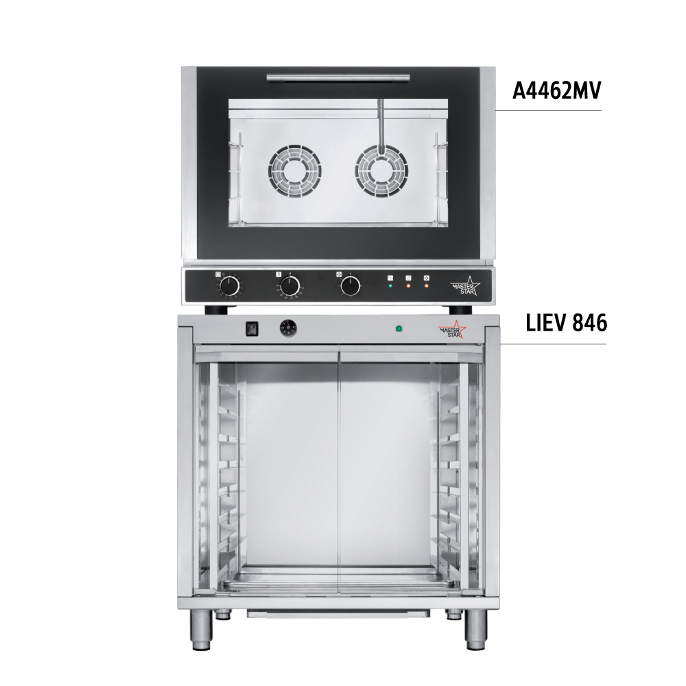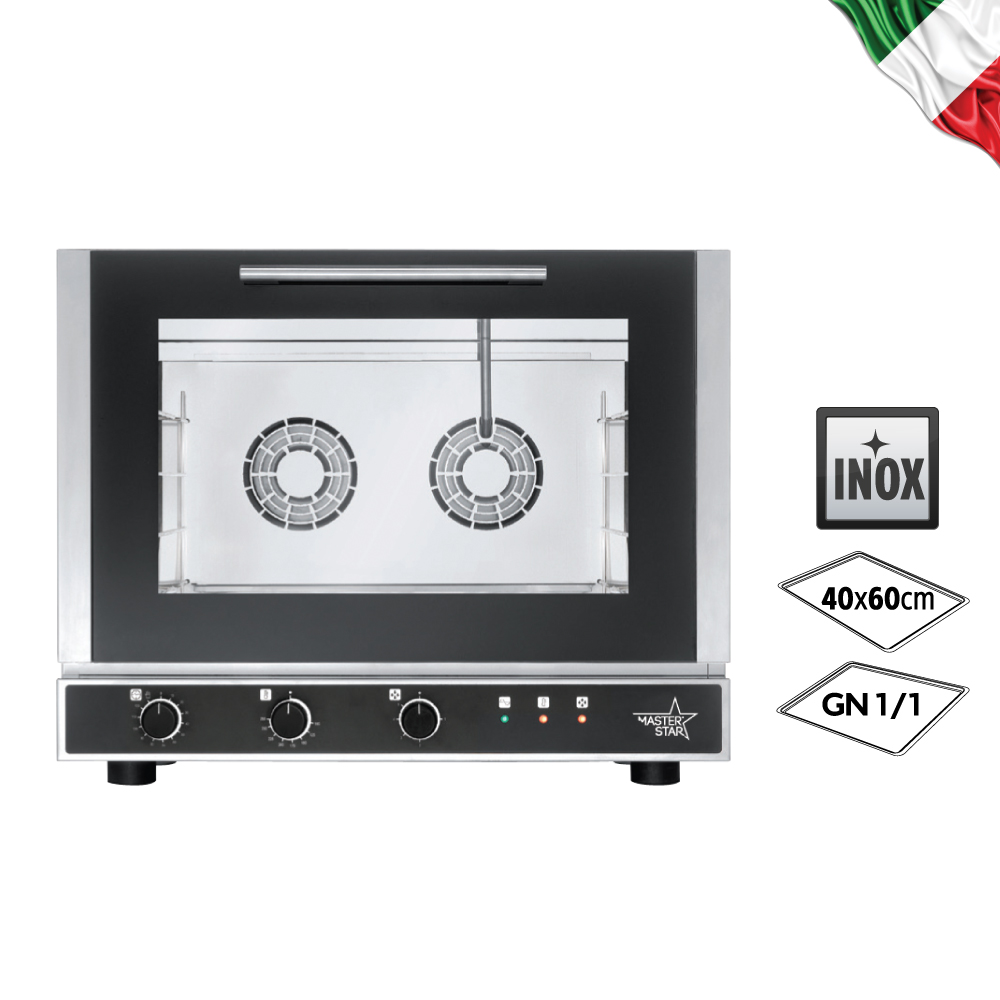 Διαστάσεις 784x752x634(h)mm Χωρητικότητα 4 λαμαρίνες (600x400mm ή GN 1/1) Απόσταση μεταξύ λαμαρινών 83 mm Θερμοστάτης 100°C - 260oC Ισχύς 6,4 KWatt, 380-400V/ 3N / 50Hz Ανεμιστήρες 2 εναλλασόμενης φοράς Βάρος 58 Kg Οι λαμαρίνες ή GN δεν περιλαμβάνονται. Υγραντήρας απευθείας ψεκασμού