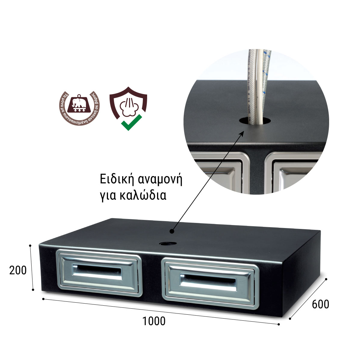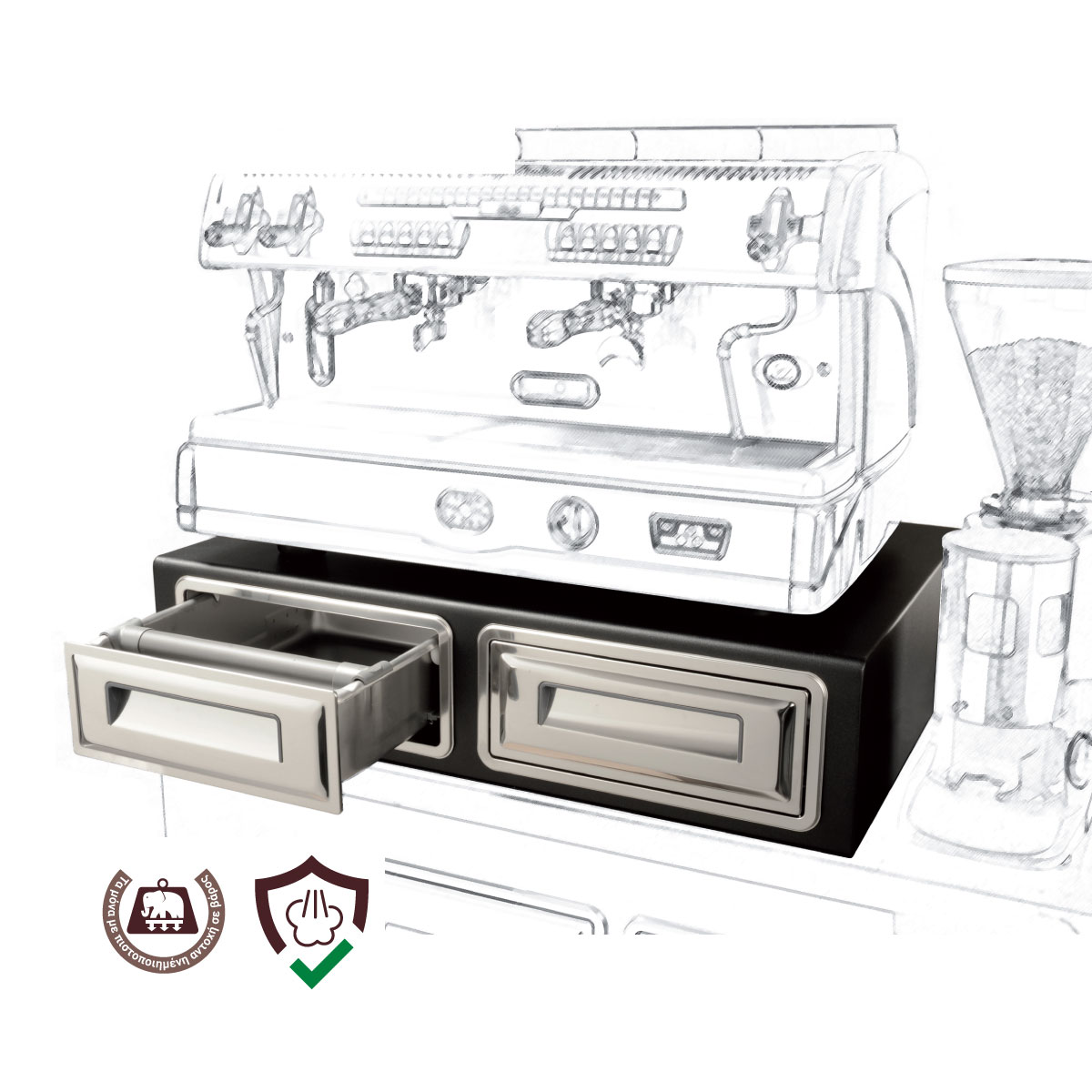 Διαστάσεις 1000x600x200(h)mm Υλικό κατασκευής Inox 304 Περίβλημα από προπυλένιο για προστασία από τους ατμούς της μηχανής καφέ Περιλαμβάνει : Τρύπα καλωδιώσης Συρτάρι από ανοξείδωτο ατσάλι ΙΝΟΧ 304 , με μπάρα καφέ. Συρτάρι γενικής χρήσης από ανοξείδωτο ατσάλι ΙΝΟΧ 304.
