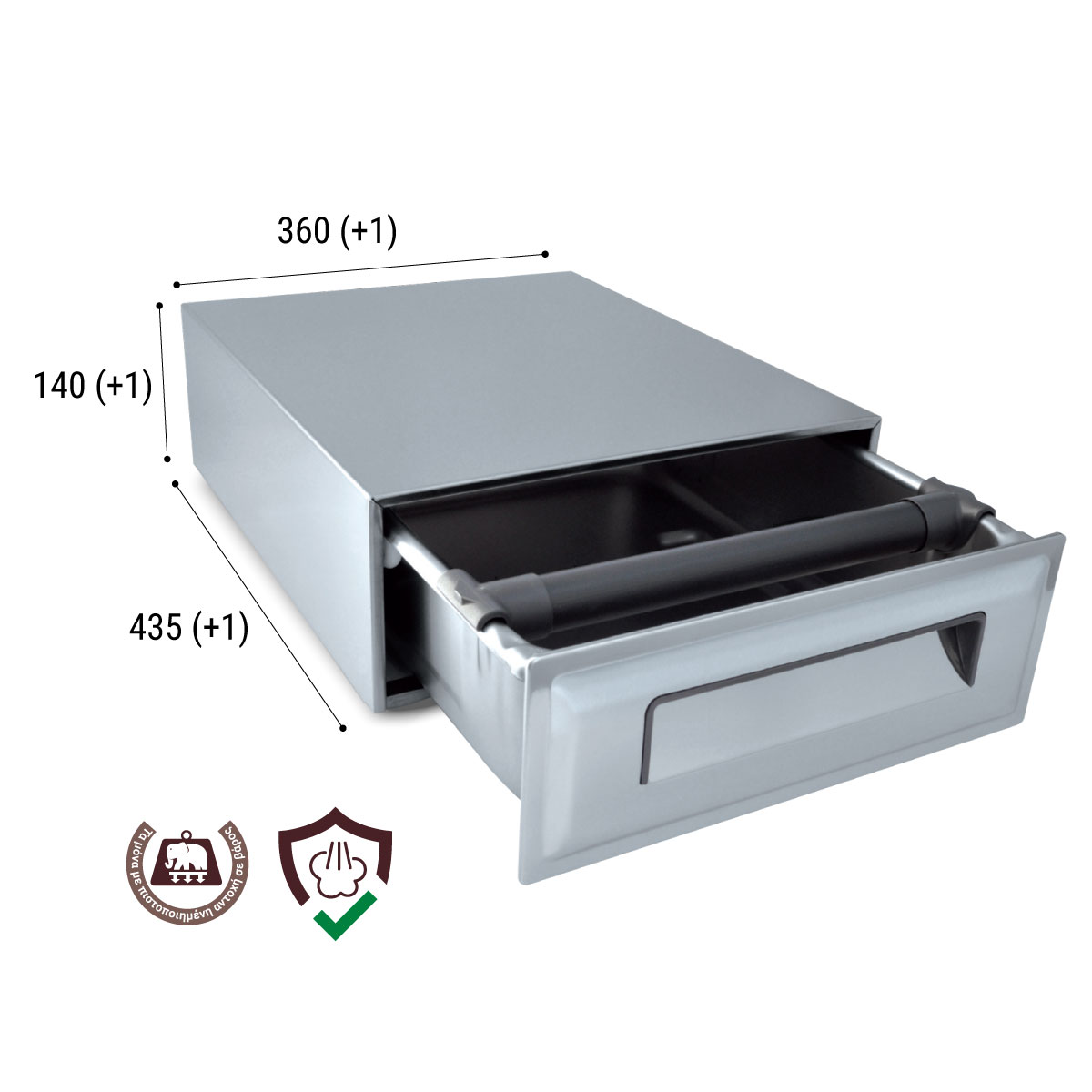 Διαστάσεις 360x435x140(h)mm Υλικό κατασκευής Inox 304 Περιλαμβάνει:Πρεσαριστό εσωτερικό συρτάρι από ανοξείδωτο ατσάλι με μπάρα καφέ.