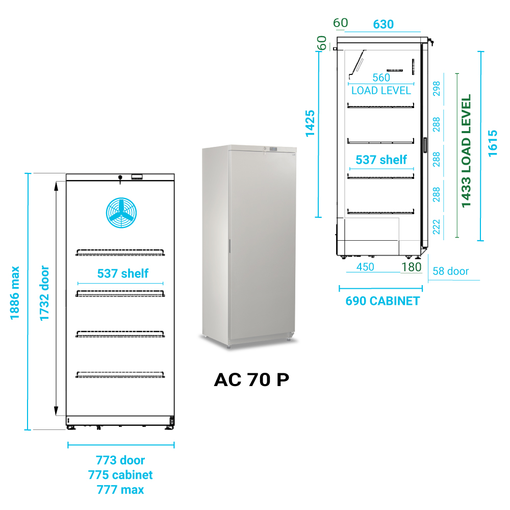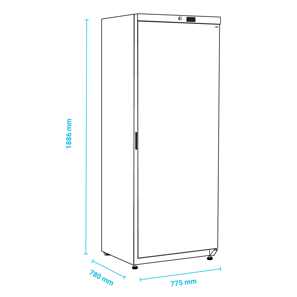Εξωτερικές διαστάσεις 775x780x1886(h)mm Χωρητικότητα 610 lt Ισχύς 180 Watt, 230V / 50 Hz Θερμοκρασία +2 / +8οC Ψύξη Στατική Απόψυξη Χειροκινήτη Ψυκτικό υγρό R290a Κλιματική κλάση 7 (+35ºC & 70%RH) Ηλεκτρονικός θερμοστάτης - θερμόμετρο Κλειδαριά 2 ρυθμιζόμενα ποδαράκια & 2 ροδάκια Χρώμα : (RAL9022) Silver Grey