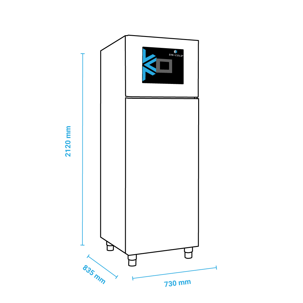 Διαστάσεις 740x832x2140(h)mm Χωρητικότητα 29 GN 2/1 ή 18 λαμαρίνες 600x400mm Θερμοκρασία -2°C / +8ºC Ισχύς 430 Watt / 230V / 50Hz Ψύξη Βεβιασμένη Απόψυξη Αυτόματη (Hot Gas) Ψυκτικό υγρό R290 Απόσταση GN GN : 45mm / λαμαρίνες : 70mm Βάρος 130 Kg