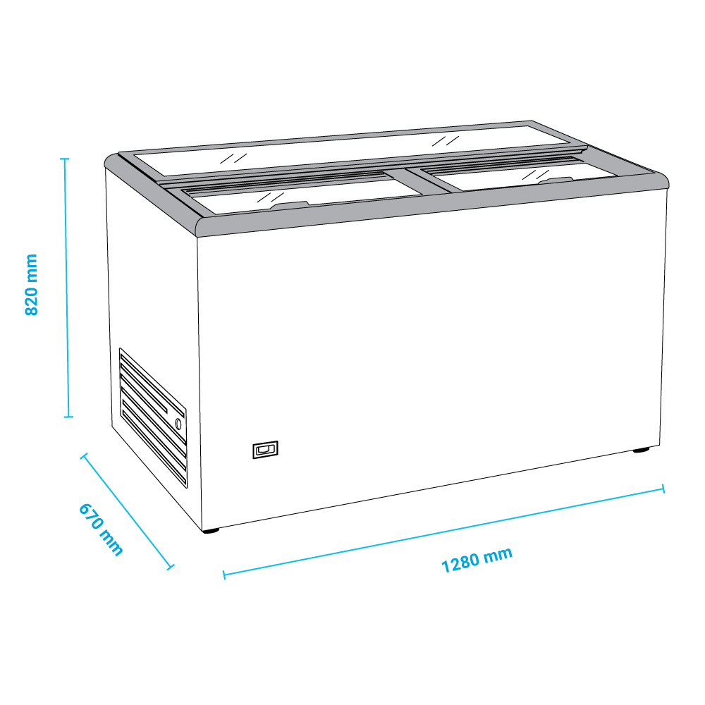 Εξωτερικές διαστάσεις 1280x670x820(h)mm Χωρητικότητα 387 lt Ισχύς 297Watt / 220-240V / 50Hz Θερμοκρασία +1ºC / +10 °C Ψύξη Στατική Ψυκτικό υγρό R134a Κλιματική κλάση 4 (30°C & 55%RH) Βάρος 48 Kg Αναλογικό θερμόμετρο Με ρόδες