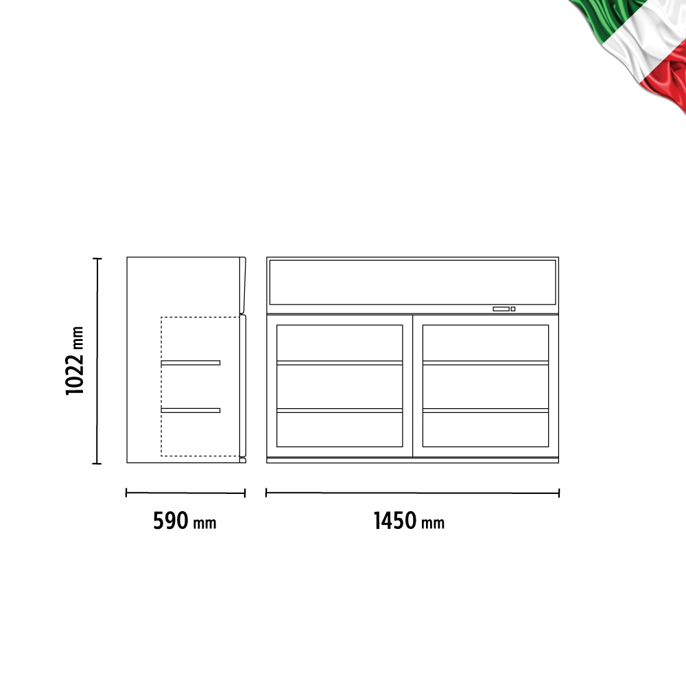 Εξωτερικές διαστάσεις 1450x590x1022(h)mm Εσωτερικές διαστάσεις 1330x390x645(h)mm Θερμοκρασία -22ºC / -18οC Ισχύς 650 Watt / 220-240V / 50Hz Ψύξη Στατική Απόψυξη Αυτόματη (Hot gas) Ψυκτικό υγρό R290 Κλιματική κλάση 3 (+25ºC & 60%RH) Χωρητικότητα 373 lt Ράφια 4 (649x292mm) Φωτισμός LED Βάρος 149 kg 2 ανοιγόμενες πόρτες Ηλεκτρονικό/ς θερμοστάτης/θερμόμετρο