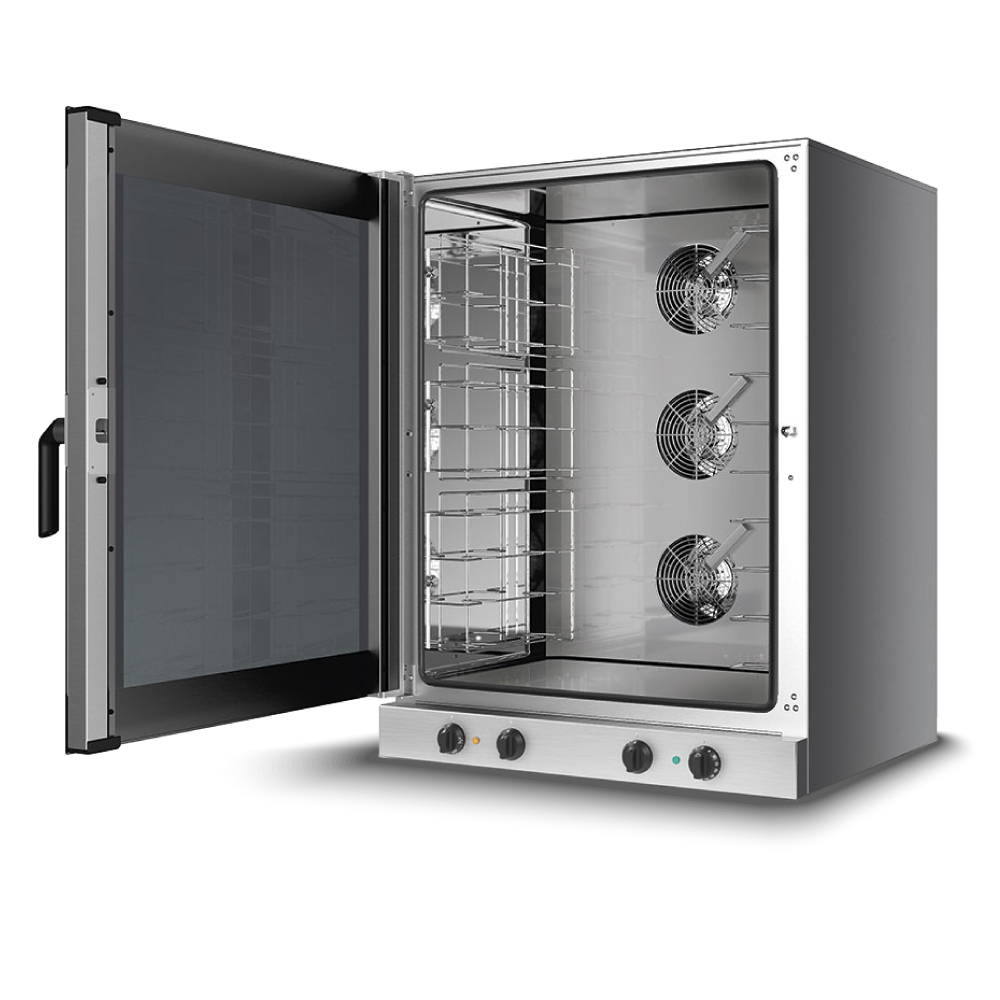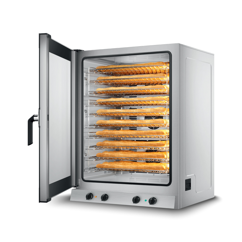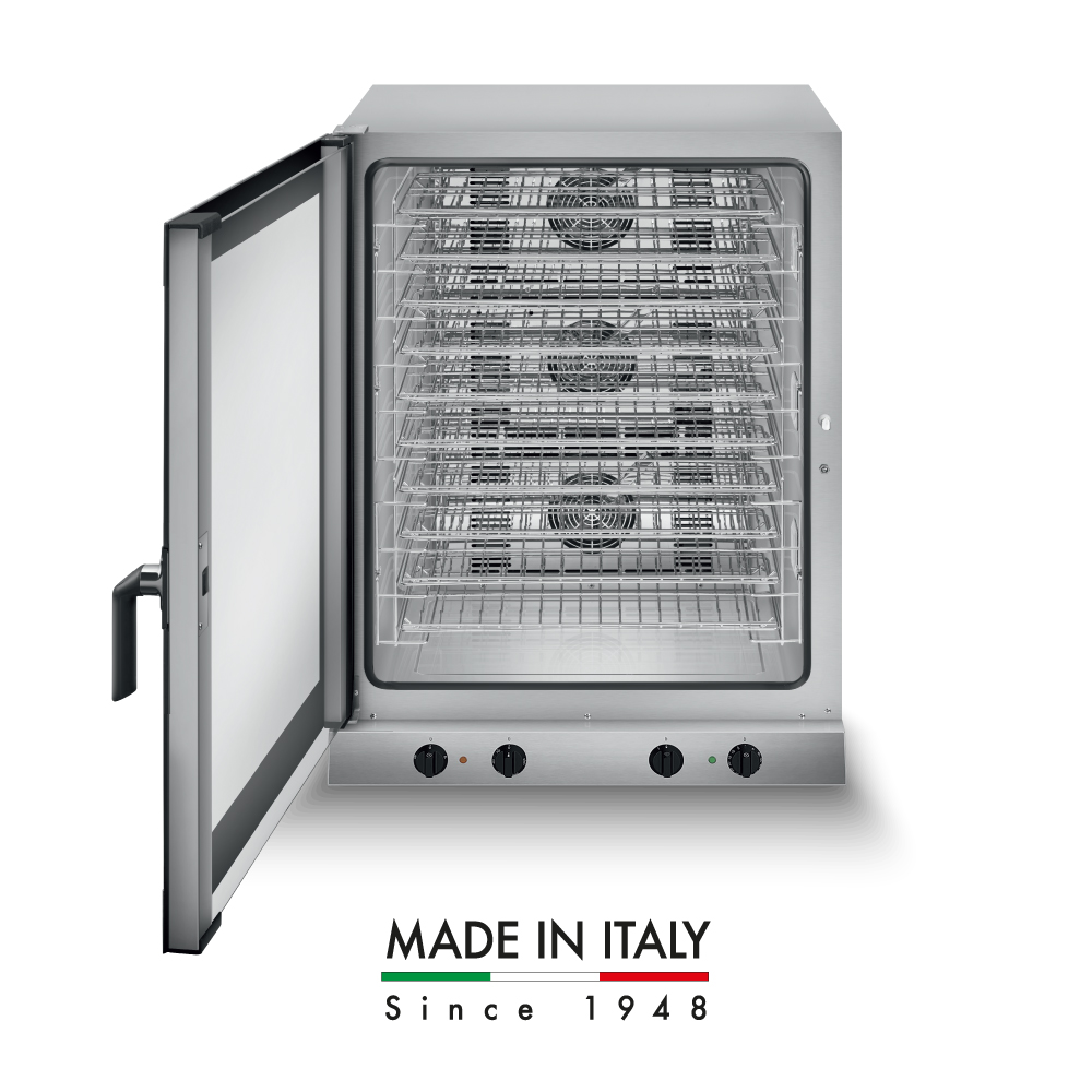 'Διαστάσεις 798x757x1100(h)mm Χωρητικότητα 10 λαμαρίνες (600x400) ή GN 1/1 Απόσταση μεταξύ θέσεων 77 mm Θερμοστάτης 50°C - 270oC Χρονοδιακόπτης 1-60'' ρυθμιζόμενος & συνεχής Ισχύς 15,7 KWatt, 400V/ 3N / 50Hz Λειτουργίες Αερόθερμο ψήσιμο Αερόθερμο ψήσιμο & υγραντήρας Βάρος 70 Kg Χειροκίνητη ρύθμιση της υγρασίας INOX εσωτερικά & εξωτερικά Τρεις ισχυροί ανεμιστήρες εναλλασσόμενης φοράς Διπλή γυάλινη πόρτα πλήρως ανοιγόμενη με σύστημα δύο σταδιών για την εκκένωση του ατμού από το θάλαμο Ρυθμιζόμενα πόδια Τα GN και οι λαμαρίνες δε συμπεριλαμβάνονται'