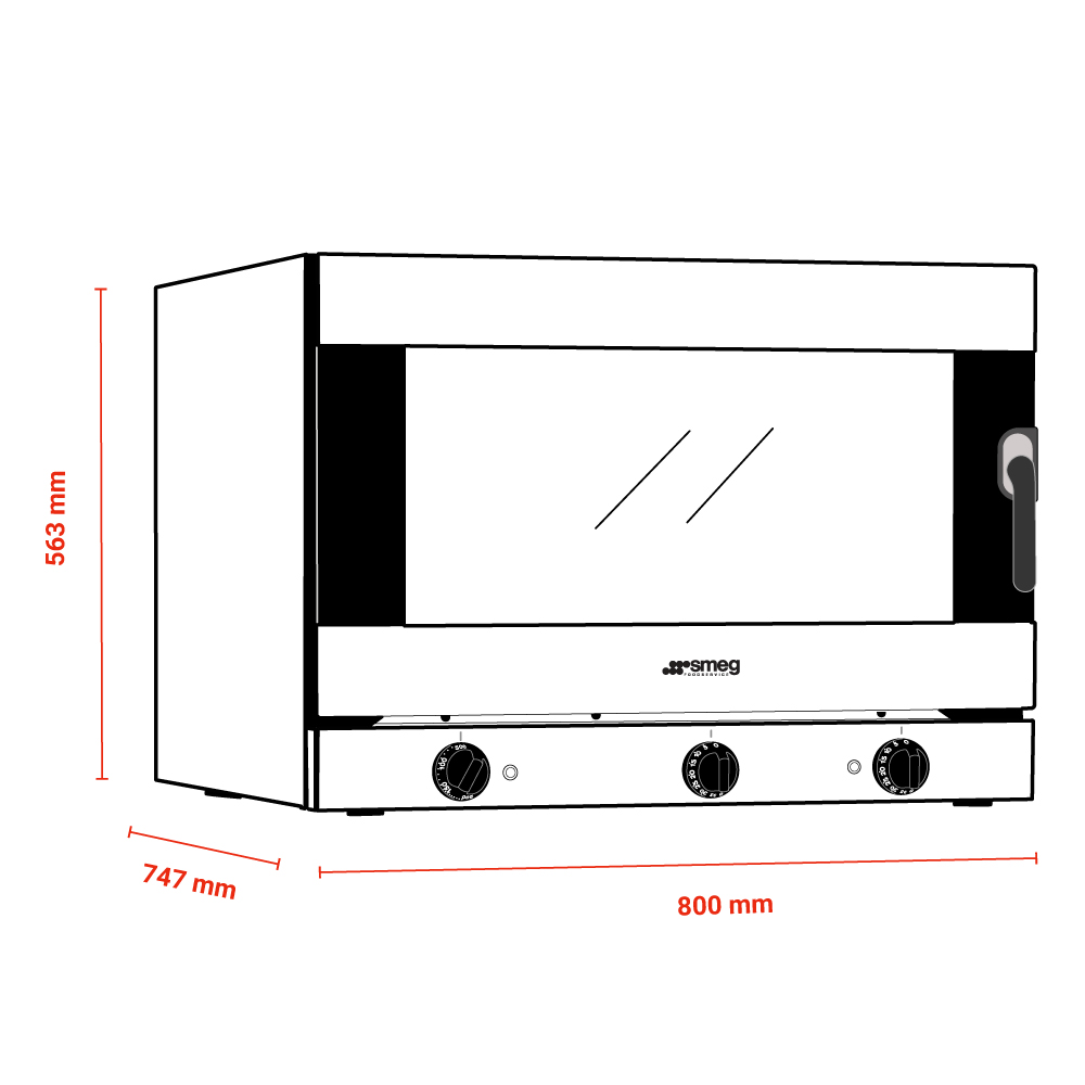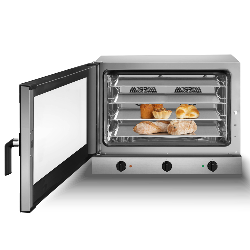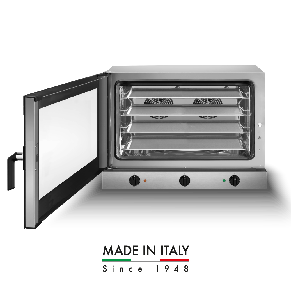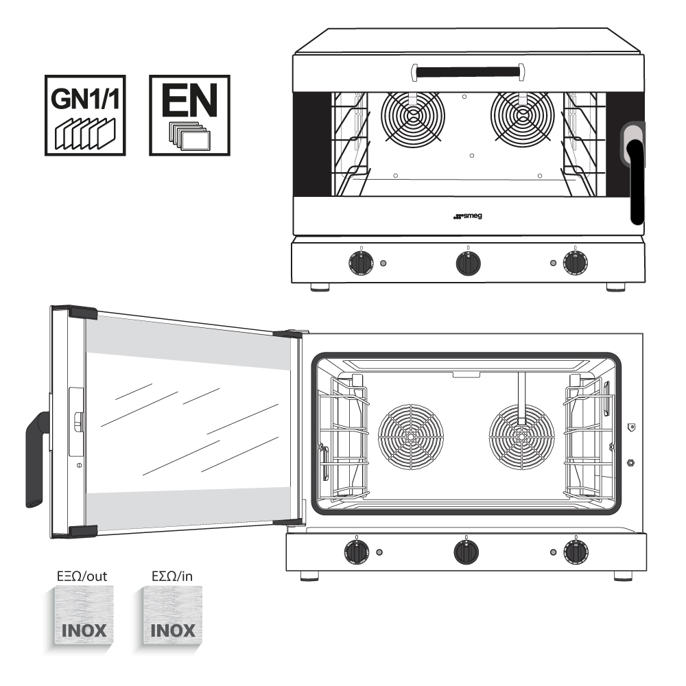 'Διαστάσεις 800x747x563(h)mm Χωρητικότητα 4 λαμαρίνες (600x400) ή GN 1/1 Απόσταση μεταξύ θέσεων 77 mm Θερμοστάτης 50°C - 270oC Χρονοδιακόπτης 1-60'' ρυθμιζόμενος + συνεχής Ισχύς 6,9 KWatt, 400V/ 3N / 50Hz Λειτουργίες Αερόθερμο ψήσιμο Αερόθερμο ψήσιμο & υγραντήρας Βάρος 58,6 Kg Υγραντήρας απ''ευθείας ψεκασμού INOX εξωτερικά Δύο ισχυροί ανεμιστήρες εναλλασσόμενης φοράς Aποσπώμενο & εύκολα καθαριζόμενο εσωτερικό τζάμι πόρτας Πόρτα ανοιγόμενη στο πλάι Τα GN και οι λαμαρίνες δε συμπεριλαμβάνονται'