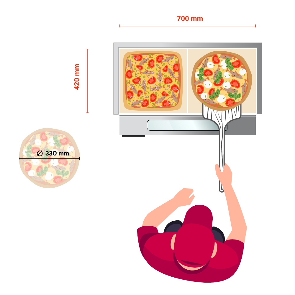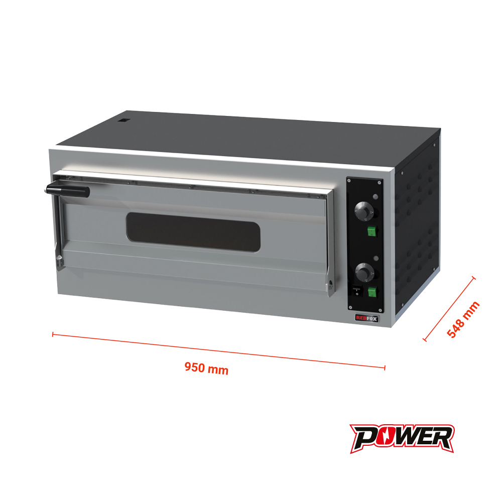 Διαστάσεις 950x548x412(h)mm Διαστάσεις θαλάμου 700x420x150(h)mm Ισχύς 4400 Watt, 400V/ 3N / 50Hz Θερμοκρασία 50ºC - 450ºC Διάμετρος πίτσας 2 x Ø 33cm Βάρος 45 kg Κωδικός προμηθευτής 111 060 039 Πυρίμαχη πλάκα κάτω πάχους 14mm 2 θερμοστάτες ρυθμιζόμενοι ξεχωριστά για άνω & κάτω αντίσταση Πόρτα με τζάμι Εσωτερικός φωτισμός