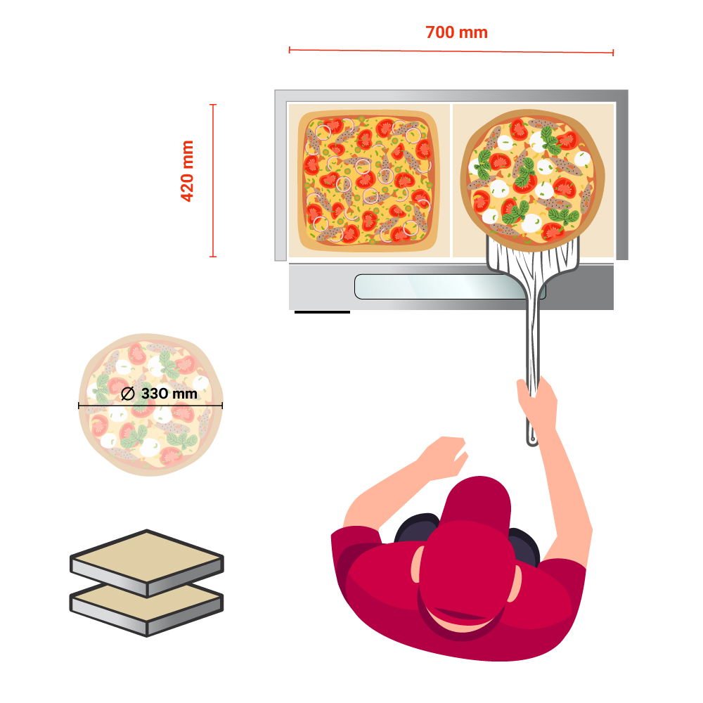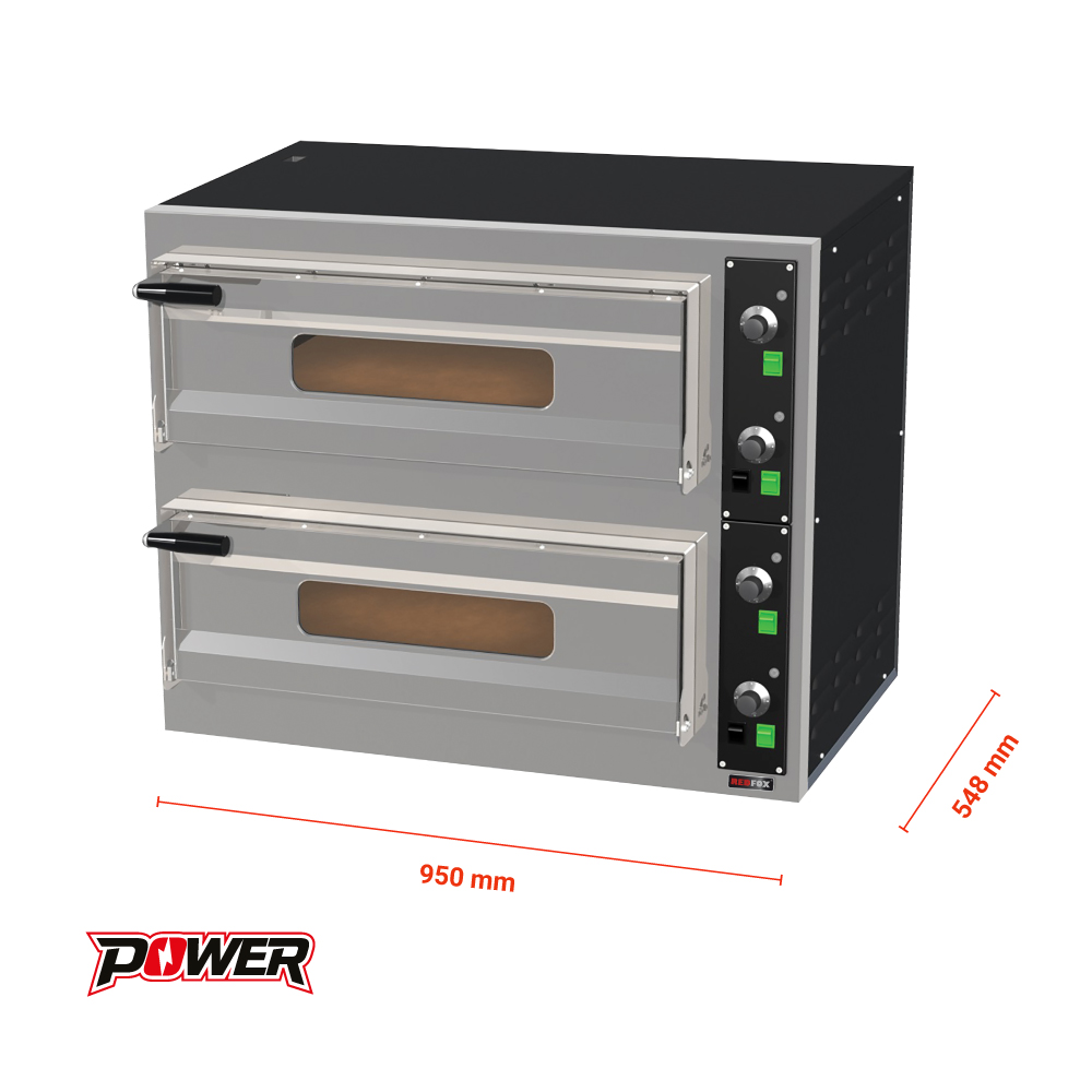 Διαστάσεις 950x548x763(h)mm Διαστάσεις θαλάμων (2x) [700x420x150(h)mm] Ισχύς 8800 Watt, 400V/ 3N / 50Hz Θερμοκρασία 50°C - 450°C Διάμετρος πίτσας 4 x Ø 33cm Βάρος 73 kg Κωδικός προϊόντος 111 060 044 Πυρίμαχη πλάκα κάτω πάχους 14mm 2 θερμοστάτες για ξεχωριστή ρύθμιση άνω & κάτω αντίστασης Πόρτες με τζάμι Εσωτερικός φωτισμός