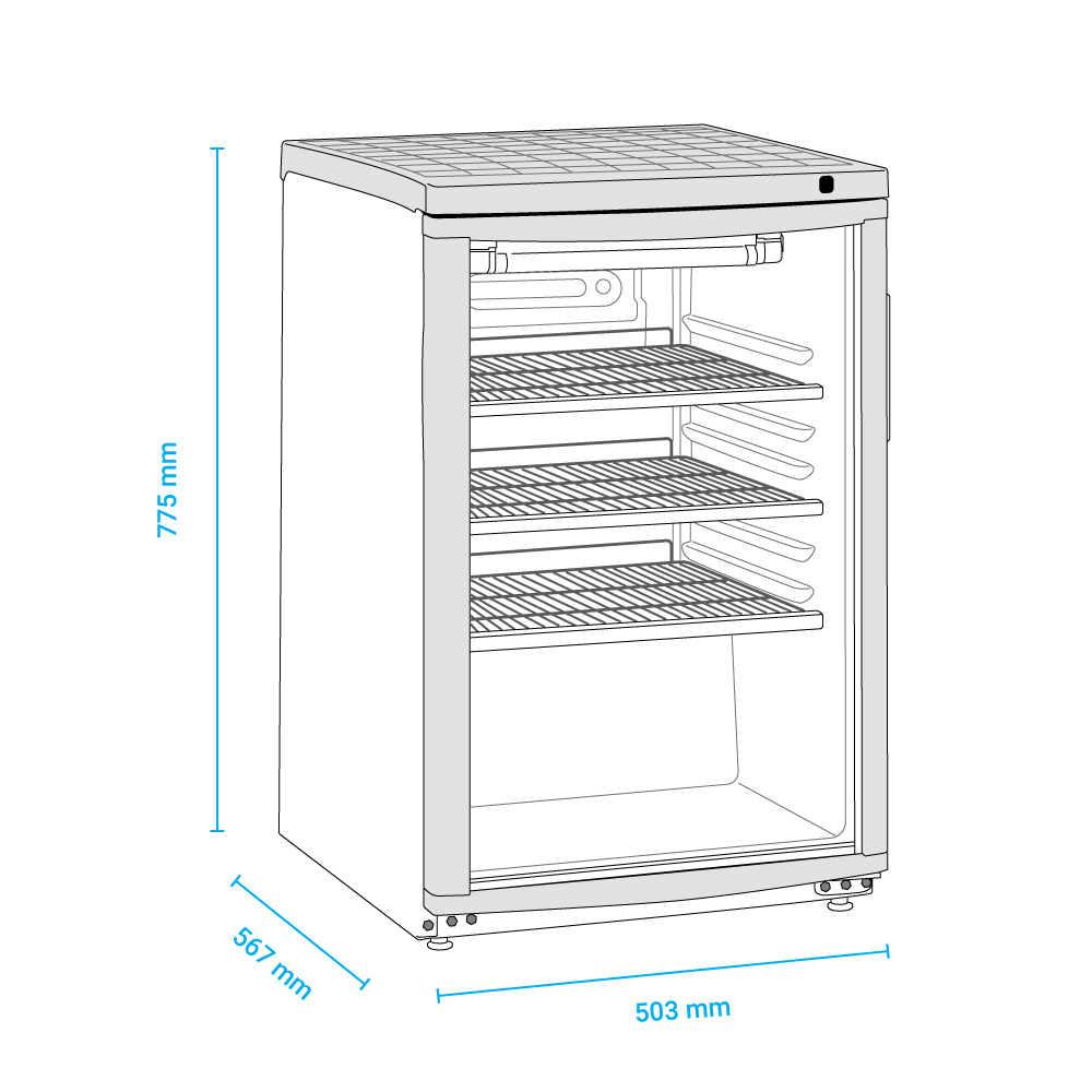 Εξωτερικές διαστάσεις 503x567x775(h)mm Εσωτερικές διαστάσεις 410x415x630(h)mm Χωρητικότητα 92 Lt Θερμοκρασία +2ºC / +10ºC Ισχύς 165Watt / 220-240V / 50Hz Ψύξη Υποβοηθούμενη με ανεμιστήρα Απόψυξη Αυτόματη Ψυκτικό υγρό R600a Ράφια 3 (410x353mm) Φωτισμός LED Κλιματική κλάση 4 (30ºC & 55%RH) Βάρος 33 Kg Ανοιγόμενη πόρτα με κουρμπαριστό κρύσταλλο Μηχανικός θερμοστάτης / θερμόμετρο Δυνατότητα αναστροφής φοράς πόρτας 4 ποδαράκια ρυθμιζόμενα Κλειδάρια
