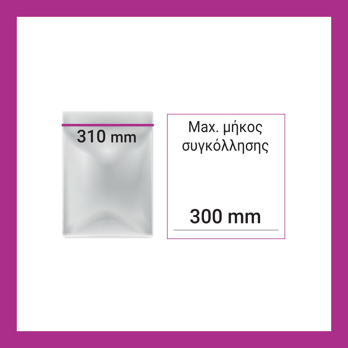 Εξωτερικές Διαστάσεις 425x500x374(h)mm Διαστάσεις θαλάμου αναρρόφησης 351x335x170(h)mm Μέγιστο μήκος συγκόλλησης 1 x 310 mm Μέγιστο μήκος σακούλας 300 mm Αντλία Vacuum 8 m³ / h Ισχύς 600Watt, 230V / 50-60Hz Βάρος 31 kg Κωδικός προϊόντος C 308 Υλικό κατασκευής : Inox H2out , κύκλος αφύγρανσης αντλίας Αδρανή αέρια Ψηφιακές ενδείξεις