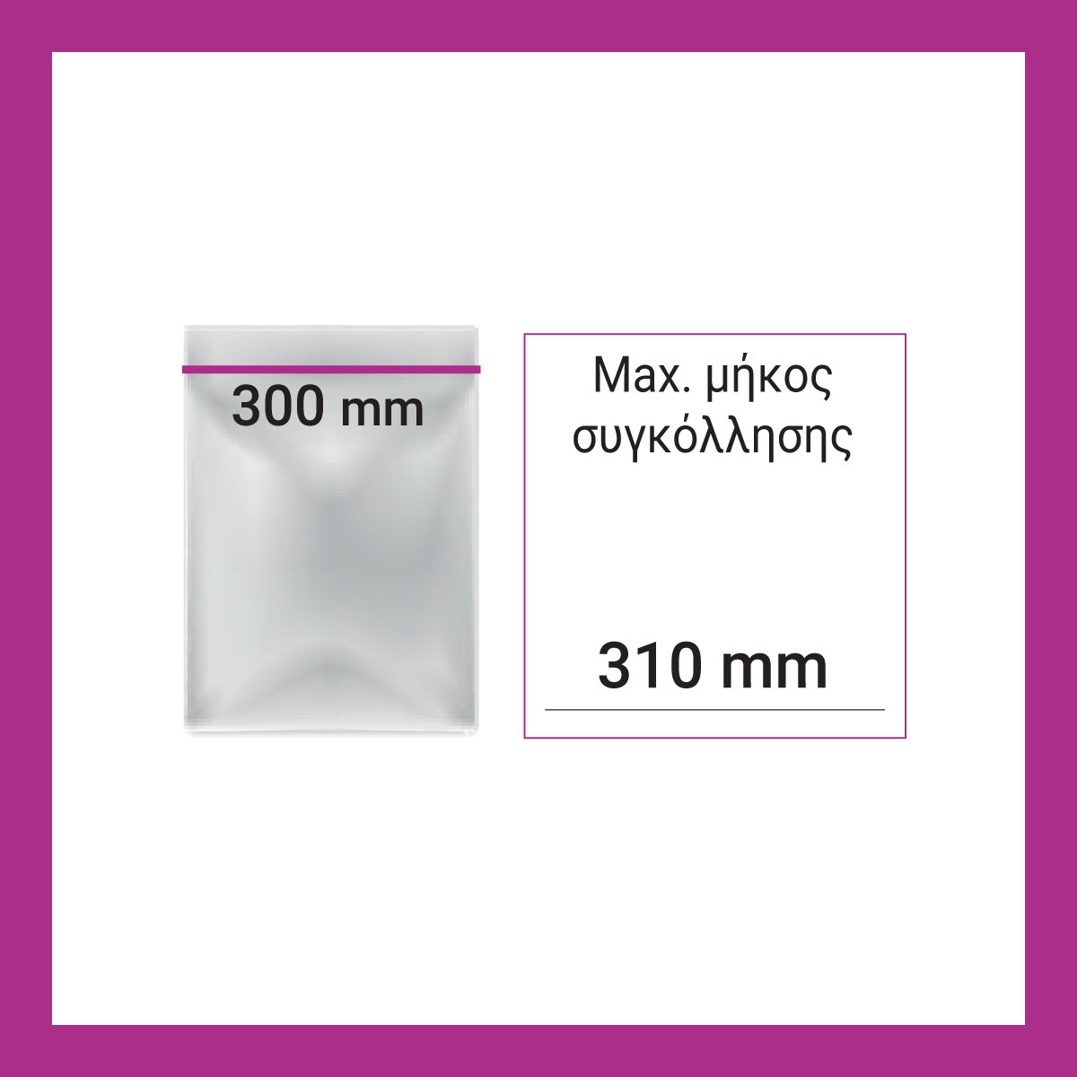 Εξωτερικές Διαστάσεις 415x592x407(h)mm Διαστάσεις θαλάμου αναρρόφησης 343x434x175(h)mm Μέγιστο μήκος συγκόλλησης 1 x 310 mm Μέγιστο μήκος σακούλας 300 mm Αντλία Vacuum 8 m³ / h Ισχύς 600Watt, 230V / 50-60Hz Βάρος 31 kg Κωδικός προϊόντος C 310 Υλικό κατασκευής : Inox H2out , κύκλος αφύγρανσης αντλίας Αδρανή αέρια Ψηφιακές ενδείξεις