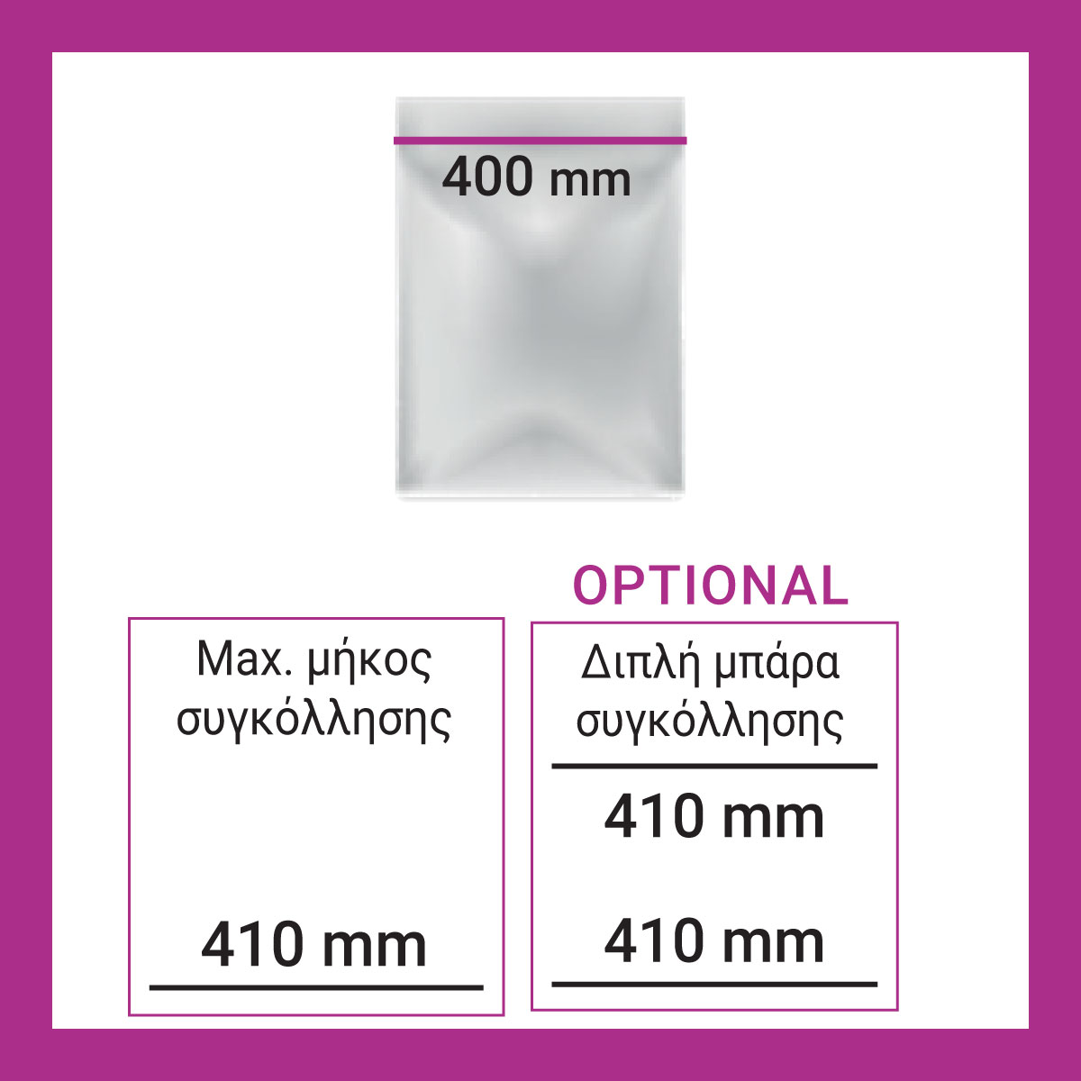 Εξωτερικές Διαστάσεις 535x591x438(h)mm Διαστάσεις θαλάμου αναρρόφησης 441x449x170(h) mm Μέγιστο μήκος συγκόλλησης 1 x 410 mm Μέγιστο μήκος σακούλας 400 mm Αντλία Vacuum 12 m³ / h Ισχύς 750Watt, 230V / 50Hz Βάρος 55,5 kg Κωδικός προϊόντος C 412 Τιμή διπλής μπάρας συγκόλλησης : (+460€) / Τιμή Web (+368€) Υλικό κατασκευής : Inox H2out , κύκλος αφύγρανσης αντλίας Αδρανή αέρια Ψηφιακές ενδείξεις