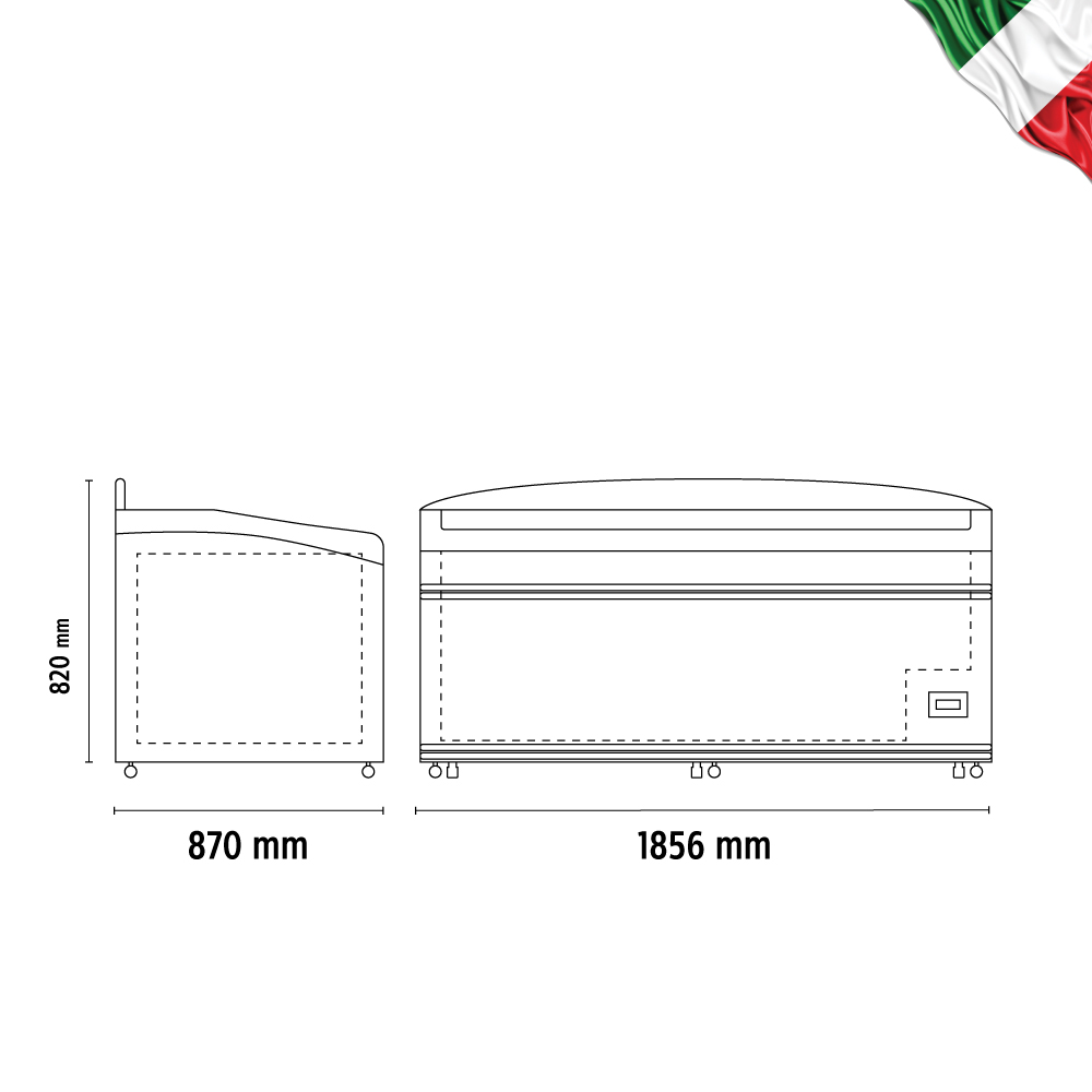 Εξωτερικές διαστάσεις 1856x870x820(h)mm Εσωτερικές διαστάσεις 1720x730x616(h)mm Χωρητικότητα 658 lt Ισχύς 442 Watt / 220-240V/ 50Hz Θερμοκρασία κατάψυξης -23°C / -18 oC Ψύξη Στατική Απόψυξη Αυτόματη Freon R290 Κλιματική κλάση 3 (25°C & 60%RH) Φωτισμός LED Βάρος 140 Kg 6 ποδαράκια & 6 ροδάκια Ηλεκτρονικός Θερμοστάτης -Ηλεκτρονικό Θερμόμετρο