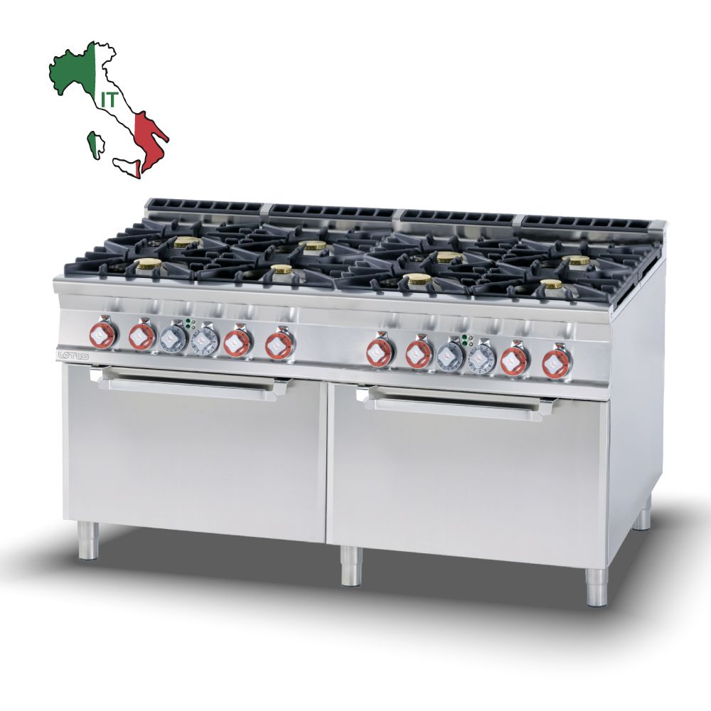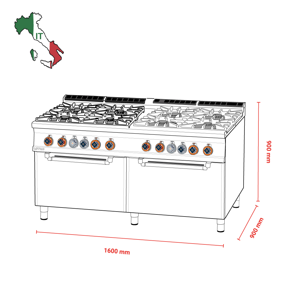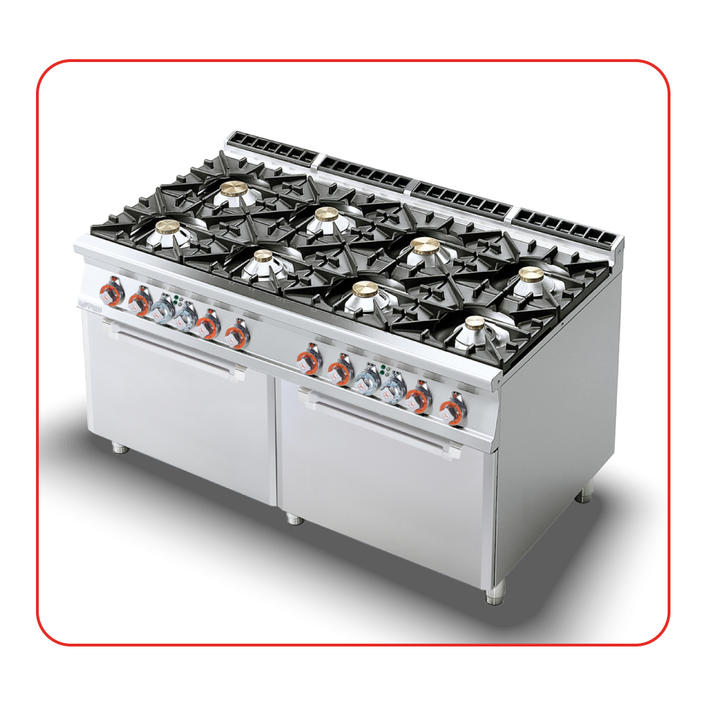 Διαστάσεις 1600x900x900(h)mm Διαστάσεις φούρνου (2x) 670x730x340(h)mm Σχάρα φούρνου 650x710mm ή GN 2/1 Συνολικη Ισχύς 73 KWatt , 62.780 Κcal/h Ισχύς εστιών 4x(7)+2x(4)+2x(10) KWatt Ισχύς φούρνου 17 Kwatt Θερμοκρασία φούρνου 150 - 300 °C Βάρος 318 Κg Κωδικός Προϊόντος 09681650 Ρυθμιζόμενα πόδια