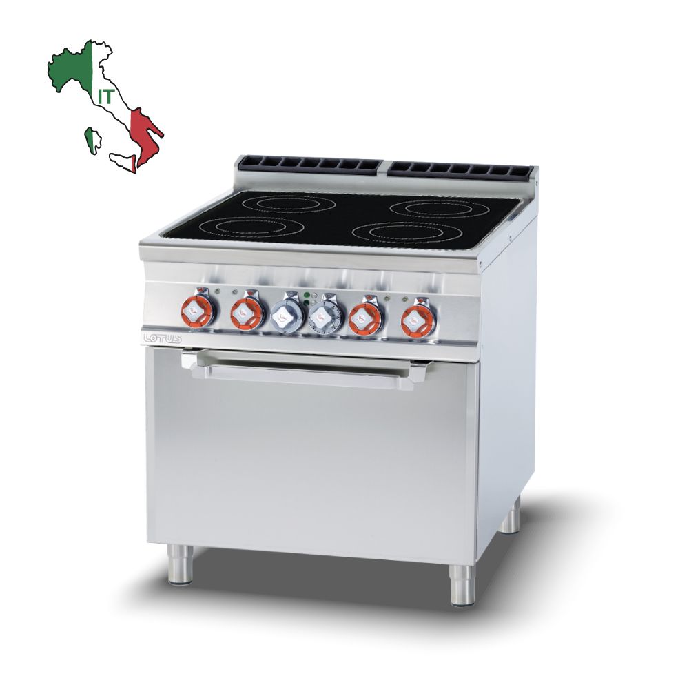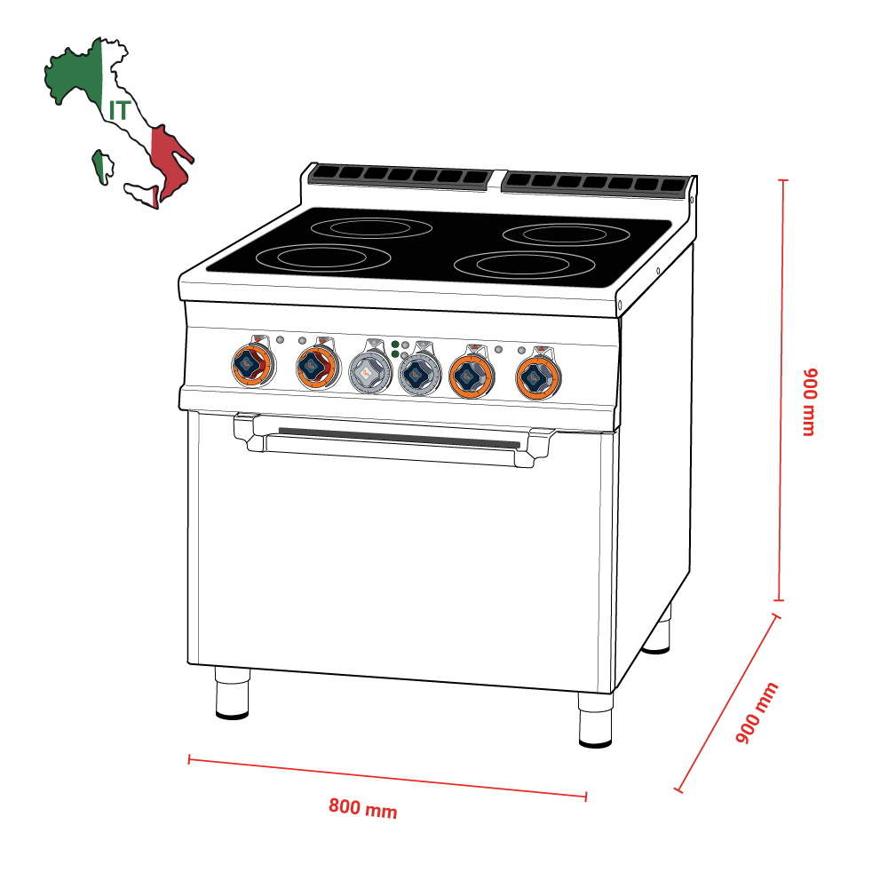 Διαστάσεις 800x900x900(h)mm Διαστάσεις επιφάνειας 750x750mm Διαστάσεις φούρνου 670x730x340(h)mm Διαστάσεις σχάρας 650x710mm ή GN 2/1 Συνολικη Ισχύς 20,32 KWatt / 400V / 50-60Hz Ισχύς εστιών 4 x 3,4 KWatt Ισχύς φούρνου 6,72 Kwatt Θερμοκρασία φούρνου 50°C - 300ºC Βάρος 130 kg Κωδικός Προϊόντος 09660832 Ρυθμιζόμενα πόδια
