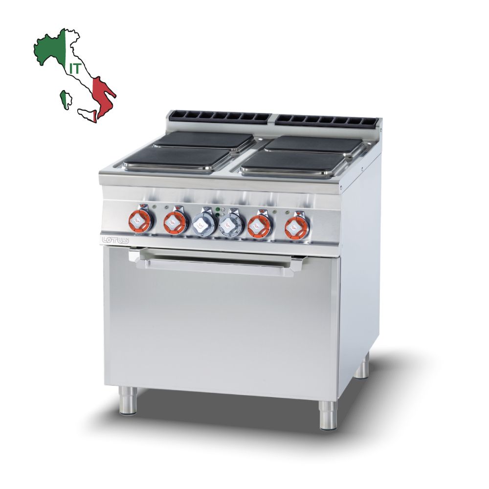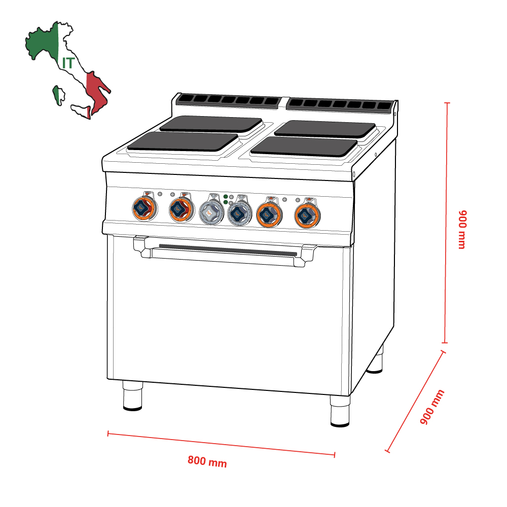 Διαστάσεις 800x900x900(h)mm Διαστάσεις φούρνου 670x730x340(h)mm Διαστάσεις σχάρας 650x710mm ή GN 2/1 Συνολικη Ισχύς 22.7 KWatt / 400V / 50-60Hz Ισχύς εστιών 4 x 4 KWatt Ισχύς φούρνου 6.7 Kwatt Θερμοκρασία φούρνου 50 - 300ºC Βάρος 150 kg Κωδικός Προϊόντος 09660831 Ρυθμιζόμενα πόδια