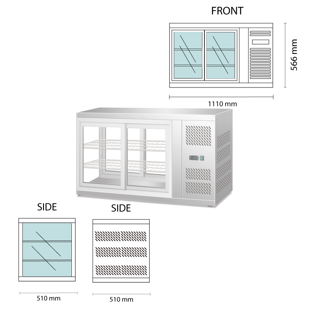 Εξωτερικές διαστάσεις 1110x510x566(h)mm Εσωτερικές διαστάσεις 790x400x390(h)mm Χωρητικότητα 163 lt Θερμοκρασία +3º / +8 οC Ισχύς 180Watt / 220-240V / 50Hz Ψύξη Βεβιασμένη Απόψυξη Αυτόματη Ψυκτικό υγρό R600A Ράφια 2 (752x390mm) Φωτισμός LED Κλιματική κλάση 4 (+30ºC & 55%RH) Βάρος 74 Kg Συρόμενες γυάλινες πόρτες μπροστά & πίσω 2 ρυθμιζόμενες σχάρες Ηλεκτρονικός θερμοστάτης - θερμόμετρο 4 ποδαράκια