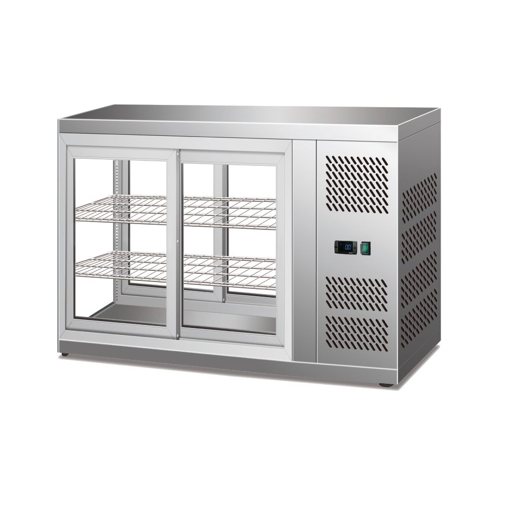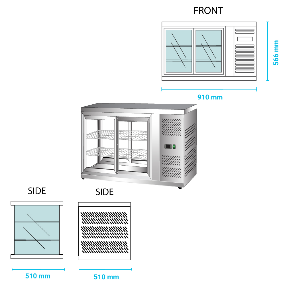 Εξωτερικές διαστάσεις 910x510x566(h)mm Εσωτερικές διαστάσεις 590x400x390(h)mm Χωρητικότητα 120 lt Θερμοκρασία +3 / +8 οC Ισχύς 180Watt / 220-240V / 50Hz Ψύξη Βεβιασμένη Απόψυξη Αυτόματη Ψυκτικό υγρό R600A Ράφια 2 (552x390mm) Φωτισμός LED Κλιματική κλάση 4 (+30ºC & 55%RH) Βάρος 65 Kg Συρόμενες γυάλινες πόρτες μπροστά & πίσω 2 ρυθμιζόμενες σχάρες Ηλεκτρονικός θερμοστάτης - θερμόμετρο 4 ποδαράκια