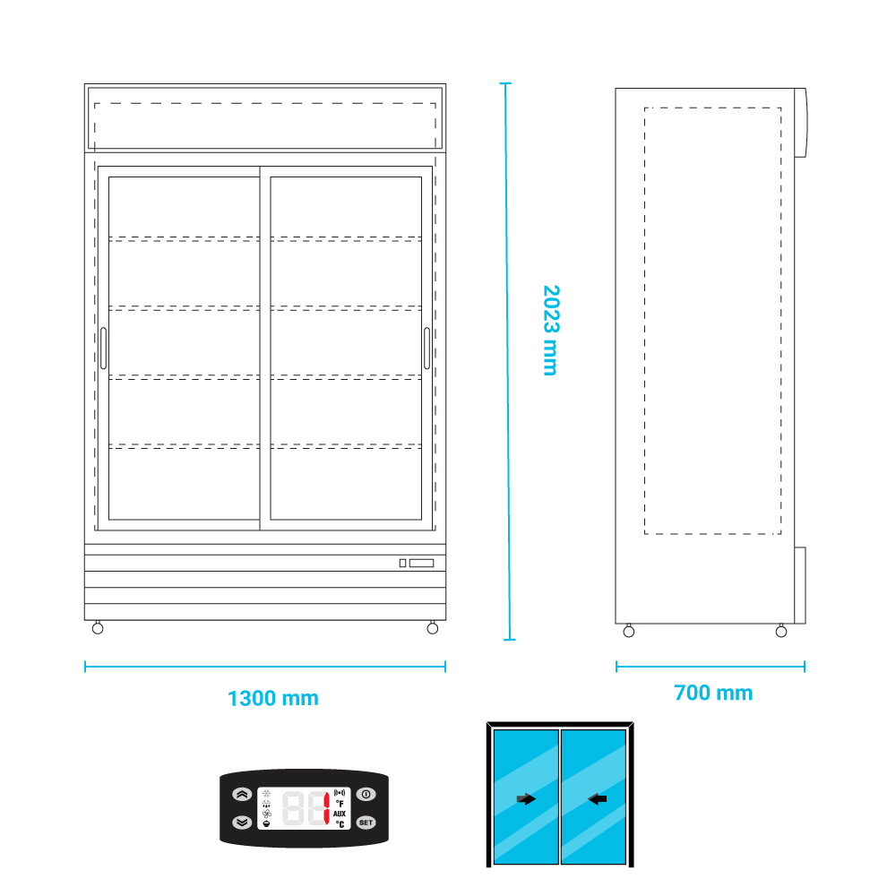 Εξωτερικές διαστάσεις 1330x700x2023(h)mm Εσωτερικές διαστάσεις 1253x503x1571(h)mm Χωρητικότητα 1057 lt Θερμοκρασία +1ºC / +10οC Ισχύς 750Watt / 220-240V / 50 Hz Ψύξη Βεβιασμένη Απόψυξη Αυτόματη Ψυκτικό υγρό R290a Ράφια 2x4 (605x410mm) Φωτισμός LED (κάθετος) Κλιματική κλάση 4 (+30°C & 55%RH) Βάρος 173 Kg Ψηφιακό Θερμόμετρο / Ηλεκτρονικός Θερμοστάτης Αυτόματη επαναφορά συρόμενης πόρτας 4 ροδάκια Κλειδαριά