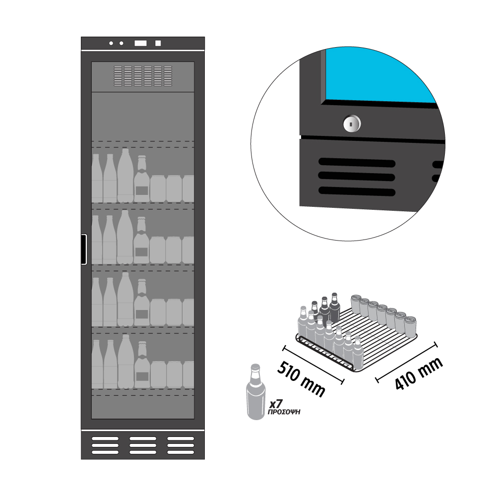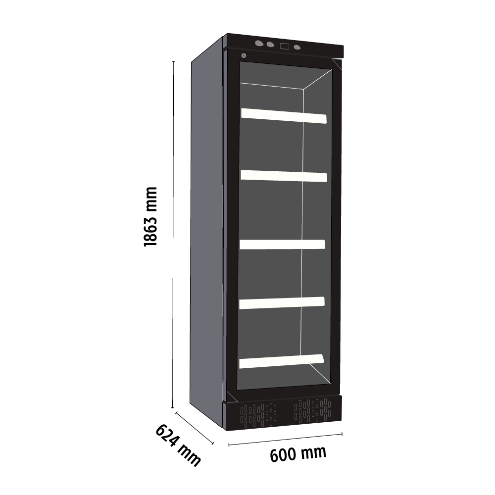 Εξωτερικές διαστάσεις 600x624x1863(h)mm Εσωτερικές διαστάσεις 522x449x1557(h)mm Χωρητικότητα 382 lt Θερμοκρασία +1ºC / +10ºC Ισχύς 220Watt / 220-240V / 50 Hz Ψύξη Βεβιασμένη Ψυκτικό υγρό R600a Ράφια 5 (513x410mm) Φωτισμός LED (κάθετος) Βάρος 77 Kg Αναλογικό θερμόμετρο Μηχανικός θερμοστάτης Κλειδαριά 2 ποδαράκια & 2 ροδάκια