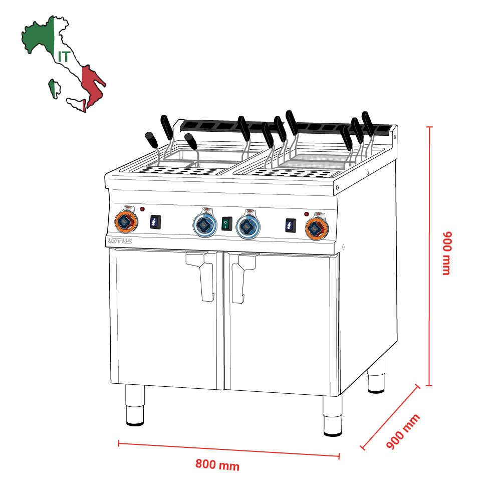 Διαστάσεις 800x900x900(h)mm Διαστάσεις βάσκας (2x) 307x509x327(h)mm Χωρητικότητα 40+40 lt Ισχύς 27,9Kw - 23.994Kcal/h Βάρος 116 kg Κωδικός Προϊόντος 09270850 Δε συνοδεύται με καλάθια! Ρυθμιζόμενα πόδια