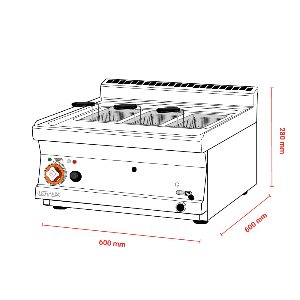Διαστάσεις 600x600x280(h)mm Διαστάσεις βάσκας 510x310x180(h)mm Χωρητικότητα 19 lt Ισχύς 9 Kwatt - 7.740Kcal/h Βάρος 45 kg Κωδικός Προϊόντος 16270650 Δε συνοδεύται με καλάθια! Ρυθμιζόμενα ποδαράκια