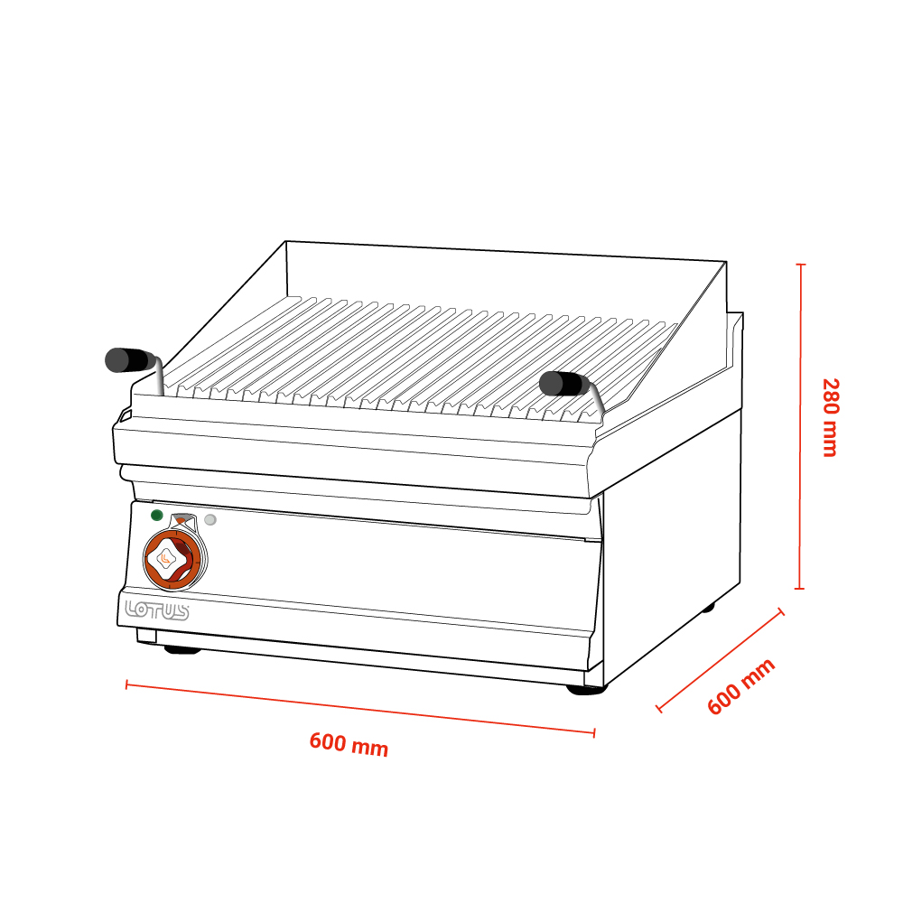 Διαστάσεις 600x600x280(h)mm Επιφάνεια ψησίματος 580x425mm Ισχύς 6,3 KWatt / 400V/ 50-60Hz Βάρος 48 kg Κωδικός Προϊόντος 16080630 Ρυθμιζόμενα ποδαράκια