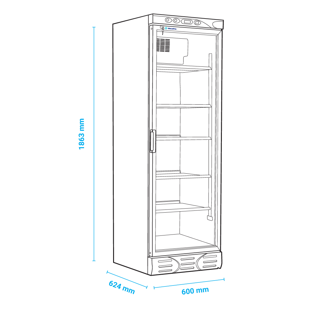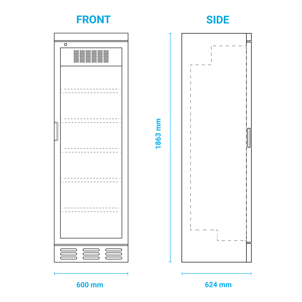 Εξωτερικές διαστάσεις 600x624x1863(h)mm Χωρητικότητα 382 lt Θερμοκρασία +1ºC / +10οC Ισχύς 220Watt / 230V / 50 Hz Ψύξη Βεβιασμένη Ψυκτικό υγρό R600a Ράφια 5 Φωτισμός LED (κάθετος) Βάρος 74 Kg