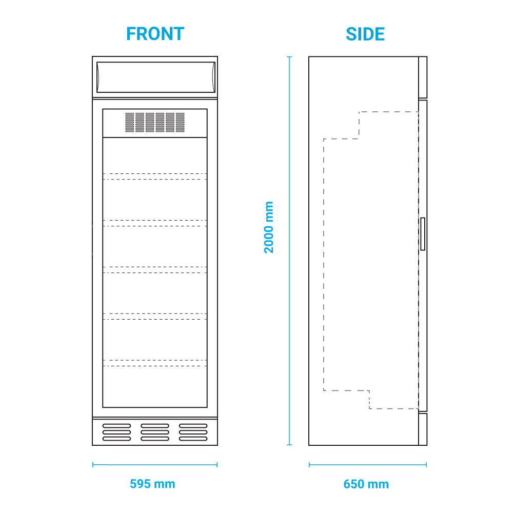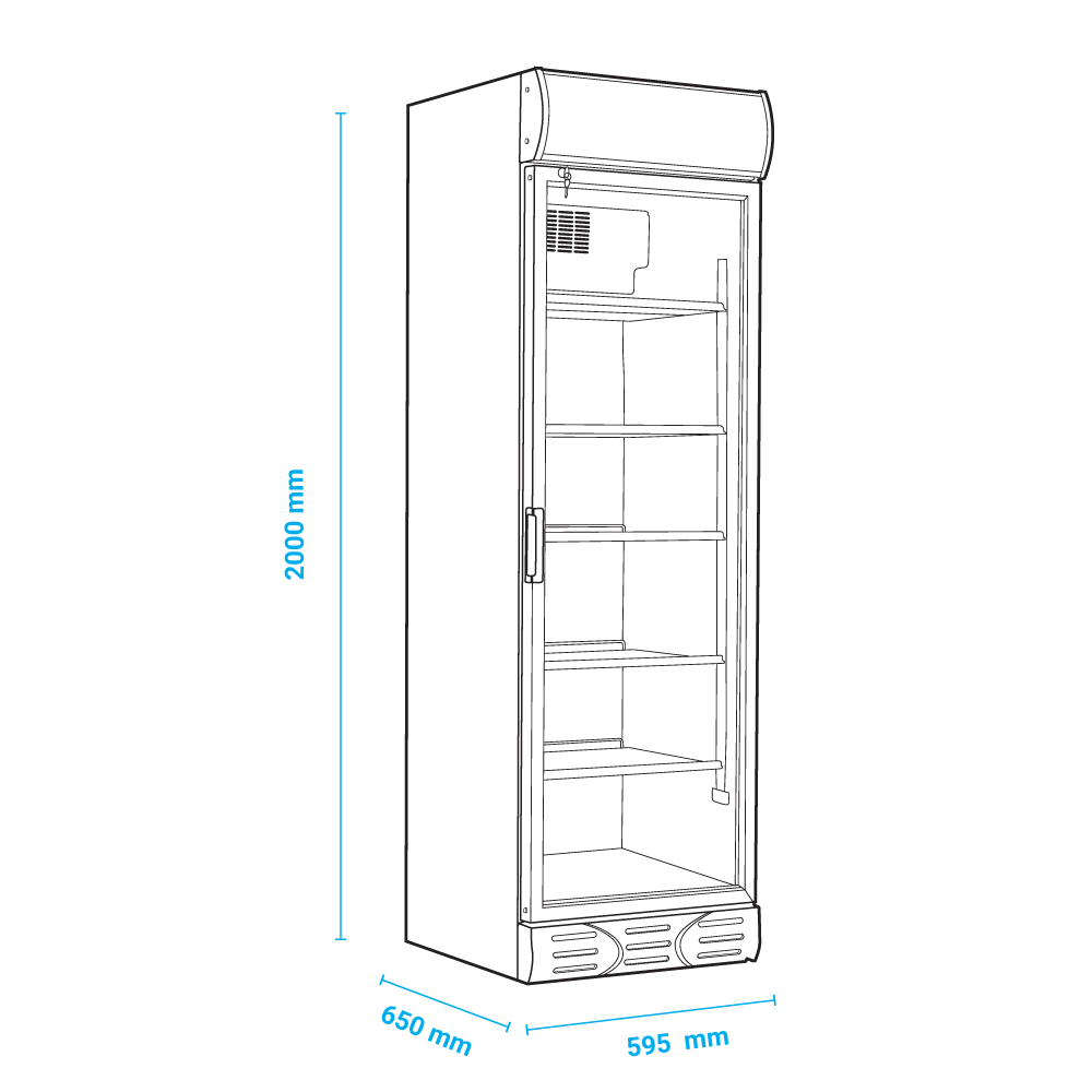 Εξωτερικές διαστάσεις 595x650x2000(h)mm Εσωτερικές διαστάσεις 490x447x1557(h)mm Χωρητικότητα 382 lt Θερμοκρασία +1ºC/+10ºC Ισχύς 210Watt / 230V / 50 Hz Ψύξη Βεβιασμένη Ψυκτικό υγρό R600a Ράφια 5 Φωτισμός LED (κάθετος + μετώπη) Βάρος 74 Kg
