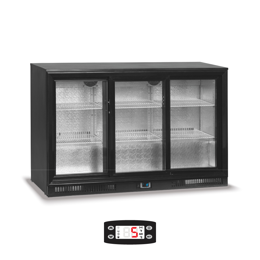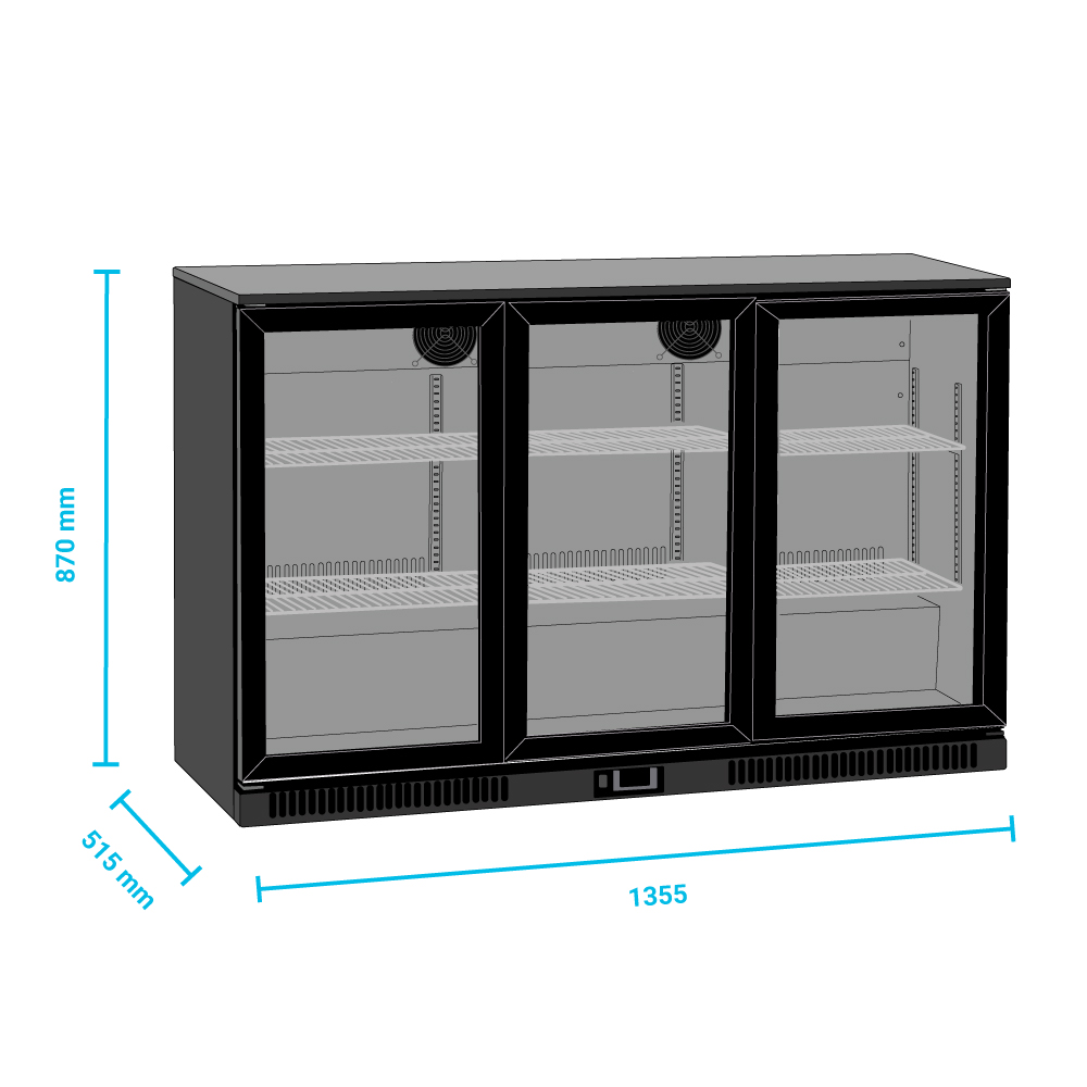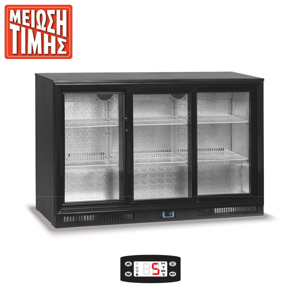 Εξωτερικές διαστάσεις 1355x515x870(h)mm Εσωτερικές διαστάσεις 1257x345x720(h)mm Χωρητικότητα 300 lt Θερμοκρασία +2º / +10οC Ισχύς 320Watt / 220-240V / 50Hz Ψύξη Βεβιασμένη Απόψυξη Αυτόματη Ψυκτικό υγρό R290 Ράφια 6 (395x330) Φωτισμός LED Κλιματική κλάση 4 (30°C & 55%RH) Καθαρό Βάρος 106 Kg 3 Συρόμενες πόρτες Ηλεκτρονικός θερμοστάτης - θερμόμετρο Κλειδαριά 4 ρυθμιζόμενα πόδια