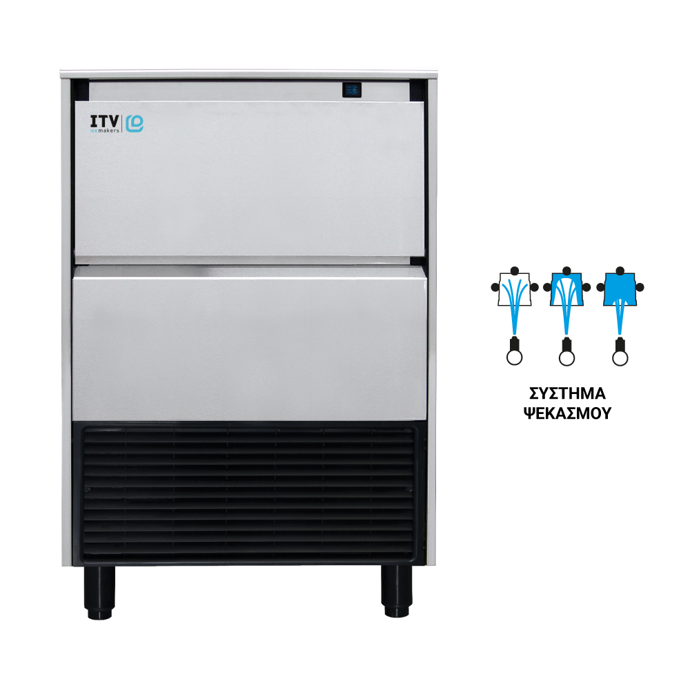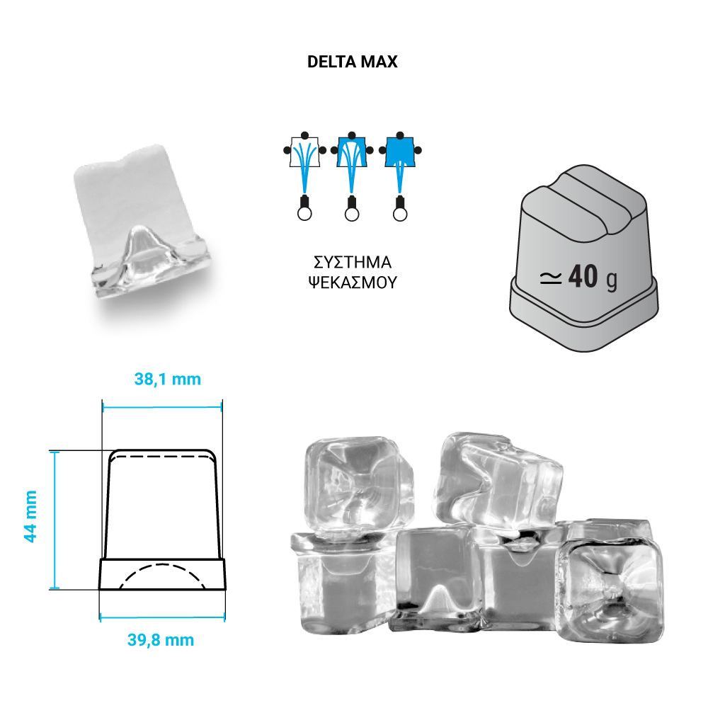 Διαστάσεις 715x700x1044*(h)mm Παραγωγή σε 24h αερόψυκτη 117* kg Ισχύς 800Watt / 230V / 50Hz Ψυκτικό υγρό R290 Παγάκια ανα κύκλο 60 Χωρητικότητα αποθήκης 60 kg Παγάκι συμπαγές 40 gr (40w x 44h mm) Καθαρό Βάρος 81 Kg *Με έξτρα πόδια : 1149/1199 mm *Θερμοκρασία περιβάλλοντος / νερού : 10°C