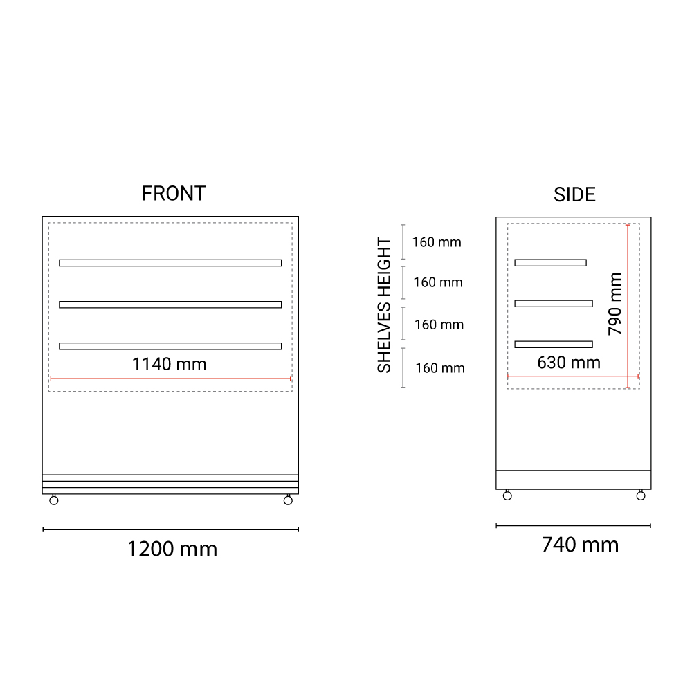 Εξωτερικές Διαστάσεις 1200x740x1300(h)mm Εσωτερικές Διαστάσεις 1140x630x790(h)mm Χωρητικότητα 610 lt Θερμοκρασία +2°C / +10oC Ισχύς 500Watt / 220-240V / 50Hz Ψύξη Βεβιασμένη Απόψυξη Αυτόματη (με αναστροφή κύκλου) Ψυκτικό υγρό R290 Ράφια γυάλινα 1(1038x278mm) & 2 (1038x318mm) Φωτισμός LED (οριζόντιος) Κλιματική κλάση 4 (+30oC & 55%RH) Καθαρό Βάρος 205 Kg Πανοραμικά πλαϊνά 4 ροδάκια Ψηφιακός θερμοστάτης - θερμόμετρο