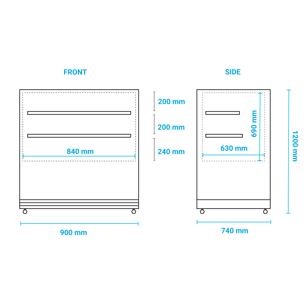 Εξωτερικές Διαστάσεις 900x740x1200(h)mm Εσωτερικές Διαστάσεις 840x630x690(h)mm Χωρητικότητα 415 lt Θερμοκρασία +2°C / +10oC Ισχύς 400Watt / 220-240V / 50Hz Ψύξη Βεβιασμένη Απόψυξη Αυτόματη (με αναστροφή κύκλου) Ψυκτικό υγρό R290 Ράφια 2 γυάλινα (738x278mm) & (738x318mm) Φωτισμός LED (οριζόντιος) Κλιματική κλάση 4 (+30oC & 55%RH) Καθαρό Βάρος 155 Kg Πανοραμικά πλαϊνά 4 ροδάκια Ψηφιακός θερμοστάτης - θερμόμετρο