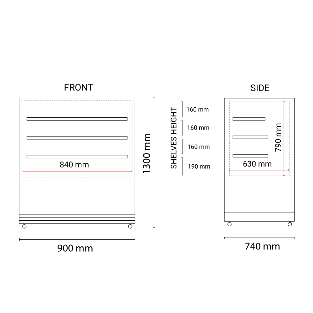 Εξωτερικές Διαστάσεις 900x740x1300(h)mm Εσωτερικές Διαστάσεις 840x630x790(h)mm Χωρητικότητα 460 lt Θερμοκρασία +2°C / +10oC Ισχύς 410Watt / 220-240V / 50Hz Ψύξη Βεβιασμένη Απόψυξη Αυτόματη (με αναστροφή κύκλου) Ψυκτικό υγρό R290 Ράφια γυάλινα 1 (738x278mm) & 2 (738x318mm) Φωτισμός LED (οριζόντιος) Κλιματική κλάση 4 (+30oC & 55%RH) Καθαρό Βάρος 170 Kg Πανοραμικά πλαϊνά 4 ροδάκια Ψηφιακός θερμοστάτης - θερμόμετρο