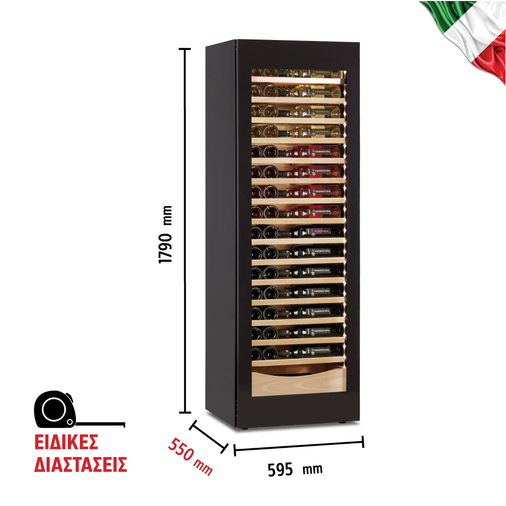 Εξωτερικές διαστάσεις 595x550x1790(h)mm Εσωτερικές διαστάσεις 493x408x1605(h)mm Χωρητικότητα 318 lt Θερμοκρασία +2ºC / +20 οC Ισχύς 115Watt / 220V / 50Hz Ψύξη Βεβιασμένη Απόψυξη Αυτόματη Ψυκτικό υγρό R600a Ράφια 15 (491x410mm) & 1(493x240mm) Φωτισμός LED Κλιματική κλάση 4(30°C & 55%RH) Βάρος 98 Kg Αυτόματη επαναφορά πόρτας με δυνατότητα αναστροφής φοράς Ηλεκτρονικός θερμοστάτης Οθόνη αφής (touch screen) 4 ποδαράκια