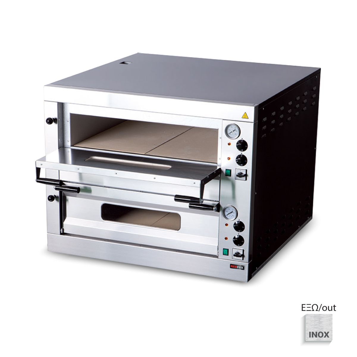 Διαστάσεις 975x1185x763(h)mm Διαστάσεις θαλάμου 2 x [700x1050x150(h)mm] Ισχύς 14.4 ΚW, 400V/ 3N / 50-60Hz Θερμοστάτης 50°C - 450°C Διάμετρος πίτσας 12 x Ø 33cm Βάρος 155,7 kg Κωδικός προμηθευτή 104 201 200 Πυρίμαχη πλάκα κάτω πάχους 14mm 2 θερμοστάτες αναλογικοί για ξεχωριστή ρύθμιση άνω & κάτω αντίστασης Πόρτες με τζάμι Εσωτερικός φωτισμός Αναλογικό θερμόμετρο για κάθε θάλαμο Κλαπέτο ατμών