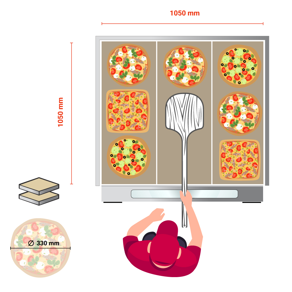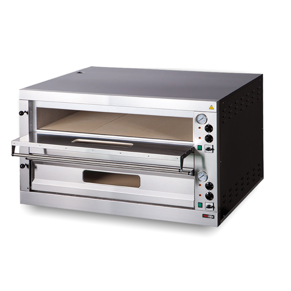 Διαστάσεις 1305x1185x763(h)mm Διαστάσεις θαλάμου 2 x [1050x1050x150(h)mm] Ισχύς 24Kw, 400V/ 3N / 50Hz Θερμοστάτης 50°C - 450°C Διάμετρος πίτσας 18 x Ø 33cm Βάρος 205,9 kg Κωδικός προμηθευτή 104 201 800 Πυρίμαχη πλάκα κάτω πάχους 14mm 2 θερμοστάτες αναλογικοί για ξεχωριστή ρύθμιση άνω & κάτω αντίστασης Πόρτες με τζάμι Εσωτερικός φωτισμός Αναλογικό θερμόμετρο για κάθε θάλαμο Κλαπέτο ατμών