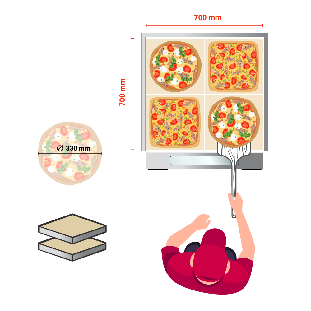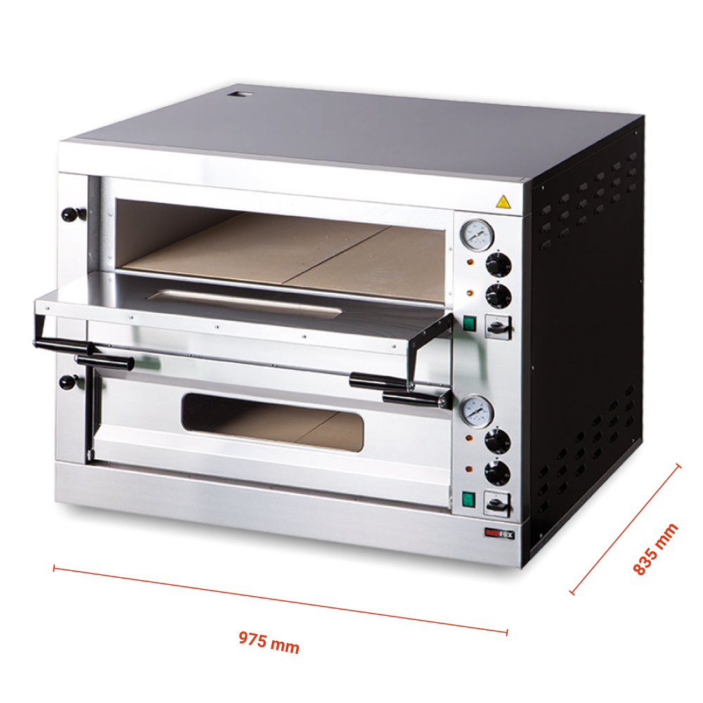 Διαστάσεις 975x835x763(h)mm Διαστάσεις θαλάμου (2x) [700x700x150(h)mm] Ισχύς 9600 Watt, 400V/ 3N / 50-60Hz Θερμοστάτης 50°C - 450°C Διάμετρος πίτσας 8 x Ø 33cm Βάρος 129 kg Κωδικός προμηθευτή 104 200 800 Πυρίμαχη πλάκα κάτω πάχους 14mm 2 θερμοστάτες αναλογικοί για ξεχωριστη ρύθμιση άνω & κάτω αντίστασης) Πόρτες με τζάμι Εσωτερικός φωτισμός Αναλογικό θερμόμετρο για κάθε θάλαμο Κλαπέτο ατμών