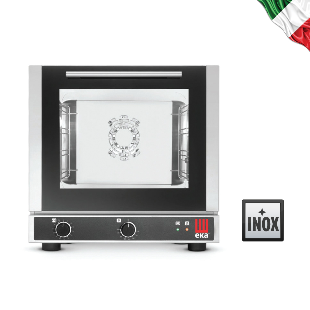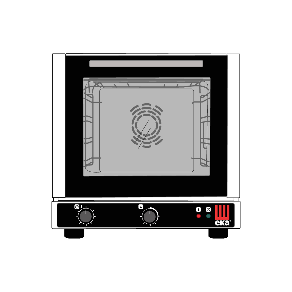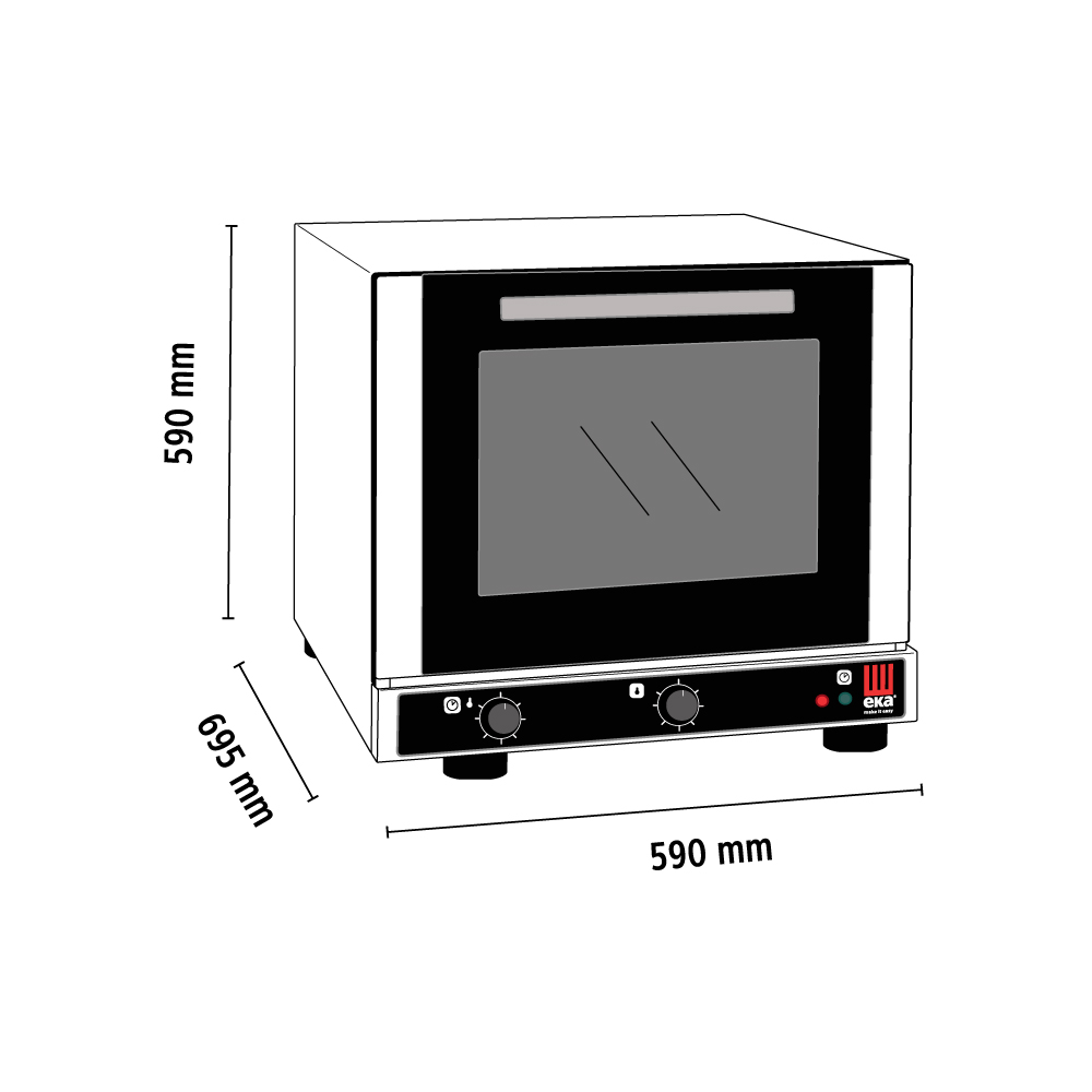 Διαστάσεις 590x695x590(h)mm Χωρητικότητα 4 λαμαρίνες (429x345mm) Απόσταση μεταξύ λαμαρινών 74 mm Θερμοστάτης 100°C - 260oC Ισχύς 2.8 KWatt, 230V/ 1N / 50-60Hz Βάρος 33 Kg Περιλαμβάνονται 4 λαμαρίνες αλουμινίου 429x345mm