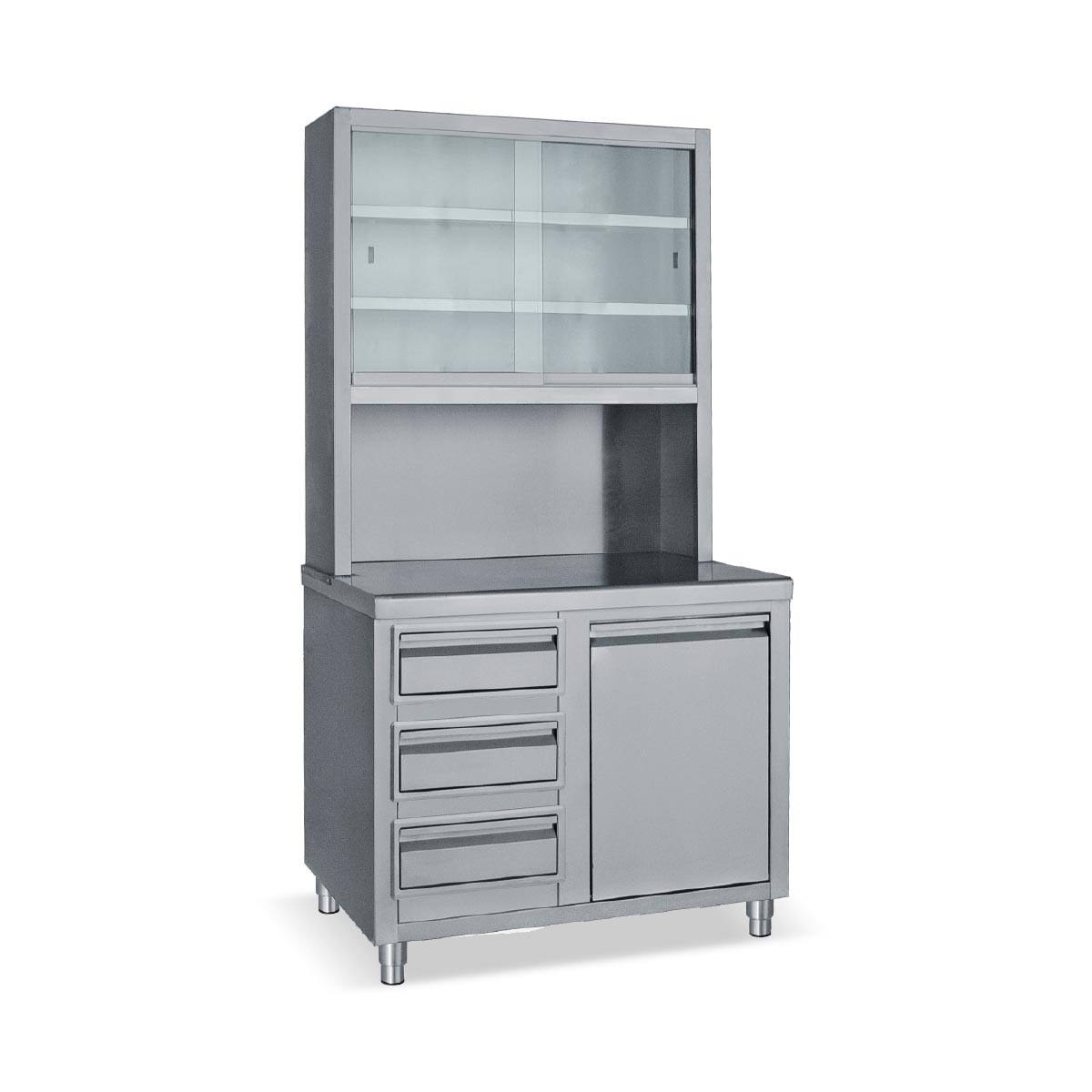 Κατασκευασμένο από ανοξείδωτο χάλυβα Πόδια ανοξείδωτα ρυθμιζόμενα Συρτάρια από ανοξείδωτο Αμπάρι ανοιγόμενο από ανοξείδωτο Ποτηριέρα με συρόμενα τζάμια