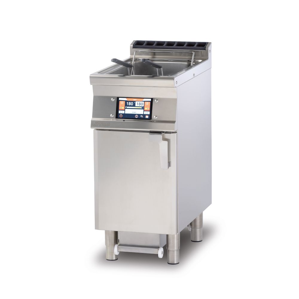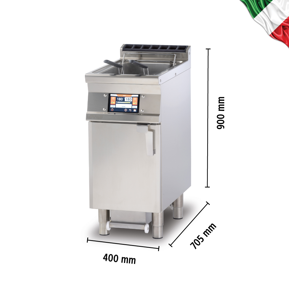 Διαστάσεις 400x705x900(h)mm Διαστάσεις κάδου 310x340x330(h)mm Διαστάσεις καλαθιών (2x) 135x290x210(h)mm Χωρητικότητα 18 lt Συνολικη Ισχύς 15,95 kW / 400V / 3N / 50-60Hz Παραγωγή 27 Kg / h Βάρος 63 Κg Κωδικός προμηθευτή 0815A430 Με φίλτρο