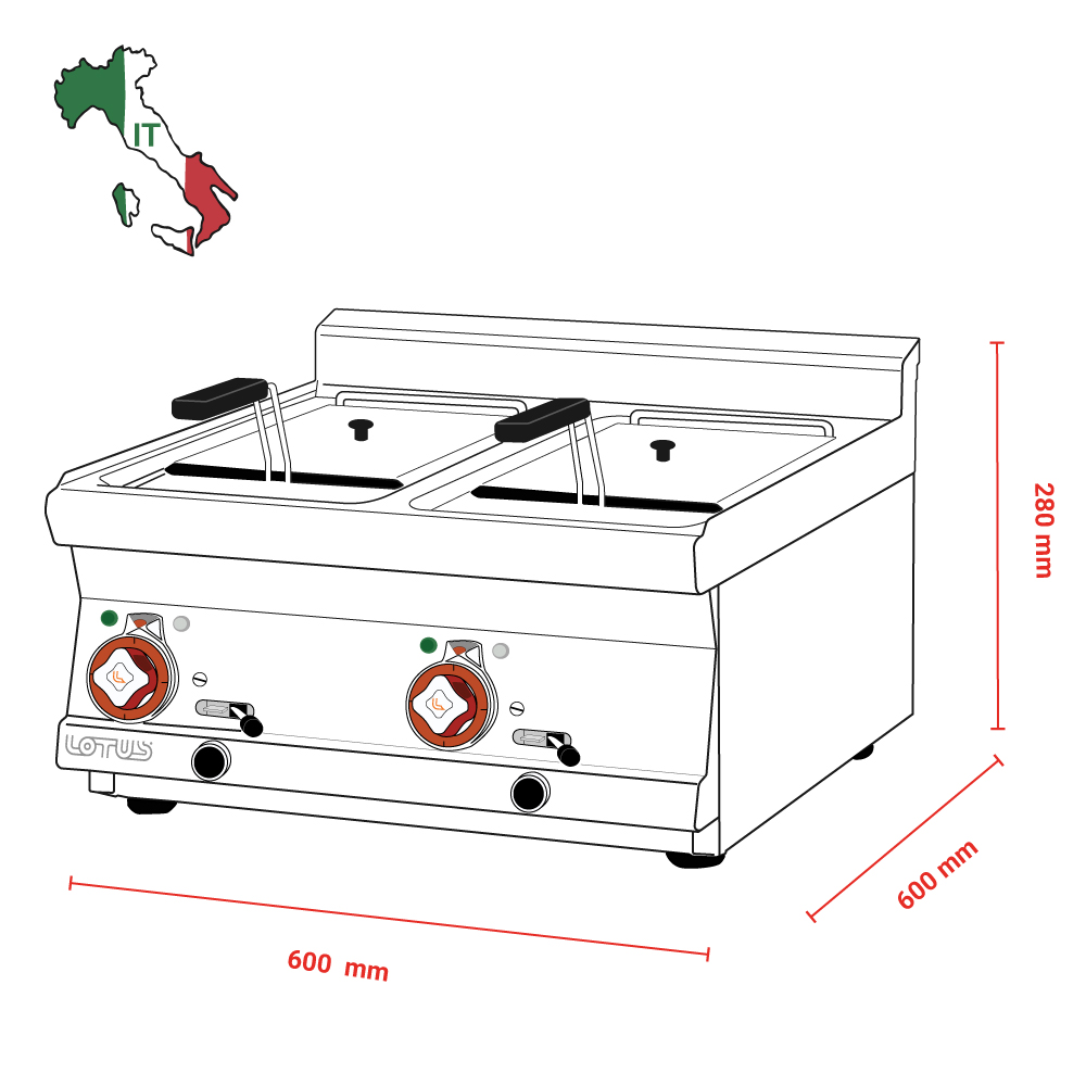 Διαστάσεις 600x600x280(h)mm Διαστάσεις βάσκας (2x) 220x350x230(h)mm Χωρητικότητα βάσκας 10 + 10 lt Διαστάσεις καλαθιού (2x) 200x300x100(h)mm Ισχύς 14,3kW / 400V / 50-60Hz Βάρος 37 kg Κωδικός προϊόντος 16090330 Ρυθμιζόμενα ποδαράκια