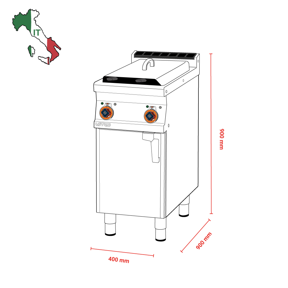 Διαστάσεις 400x900x900(h)mm Διαστάσεις βάσκας (2x) 148x350x327(h)mm Χωρητικότητα βάσκας 8+8 lt Διαστάσεις καλαθιού (2x) 120x300x150(h)mm Ισχύς 12 KWatt /400V / 50-60Hz Βάρος 63 kg Κωδικός προϊόντος 09090432 Ρυθμιζόμενα πόδια