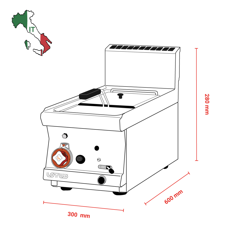 Διαστάσεις 300x600x280(h)mm Διαστάσεις βάσκας 220x275x220(h)mm Χωρητικότητα βάσκας 8 lt Διαστάσεις καλαθιού 200x240x90(h)mm Ισχύς 6κW - 5.160kCal/h Βάρος 23 kg Κωδικός προϊόντος 16260350 Ρυθμιζόμενα ποδαράκια