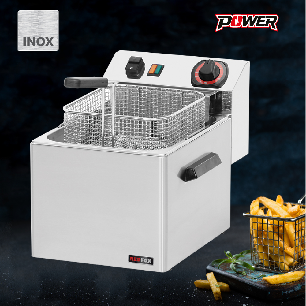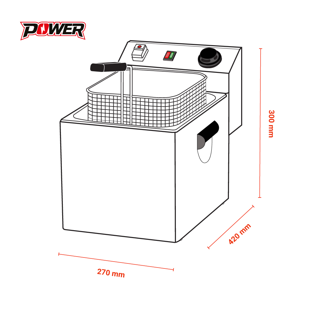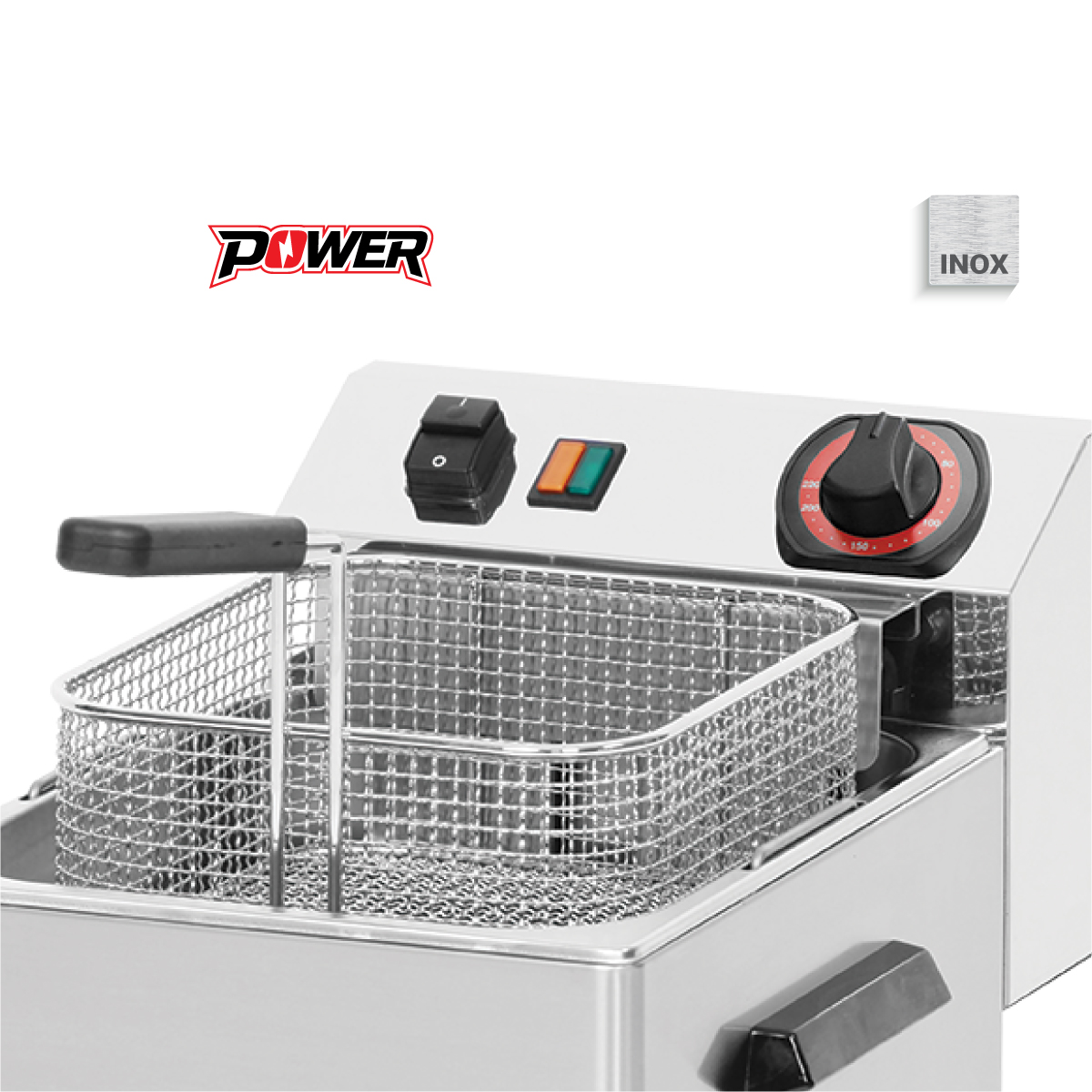 Διαστάσεις 270x420x300(h)mm Καλάθι 210x235x100(h)mm Χωρητικότητα βάσκας 8 lt Θερμοκρασία 50 - 190οC Αντίσταση 6 KWatt, 400V/ 3N / 50Hz Κωδικός Προϊόντος 100 101 500 Σύστημα κρύας ζώνης Ανοξείδωτη αντίσταση Περιλαμβάνει 1 καλάθι