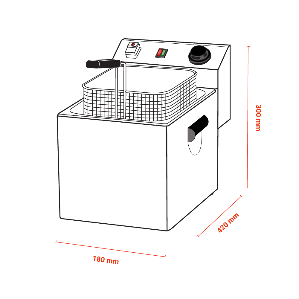 Διαστάσεις 180x420x300(h)mm Καλάθι 130x235x100(h)mm Χωρητικότητα βάσκας 5 lt Θερμοκρασία 50 - 190οC Αντίσταση 3 KWatt, 230V / 50Hz Κωδικός Προϊόντος 100 100 500 Βάρος 5,7 Kg Σύστημα κρύας ζώνης Ανοξείδωτη αντίσταση Περιλαμβάνει 1 καλάθι