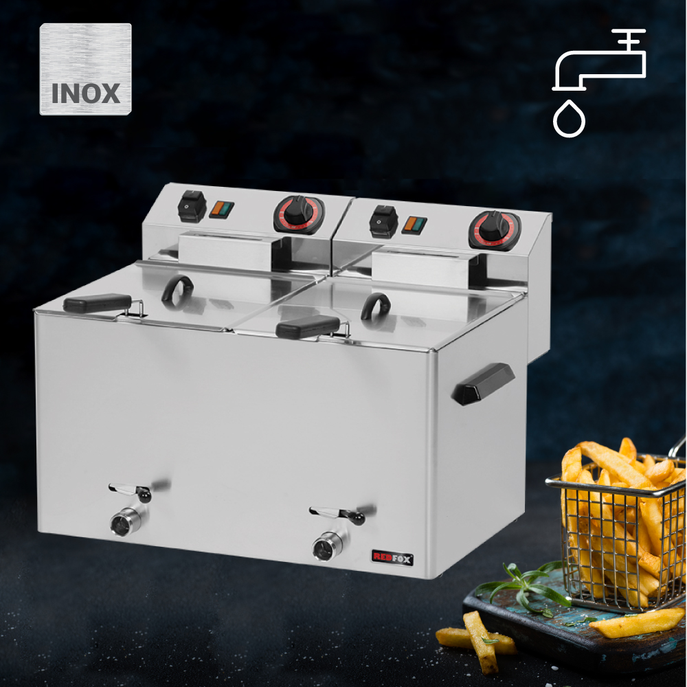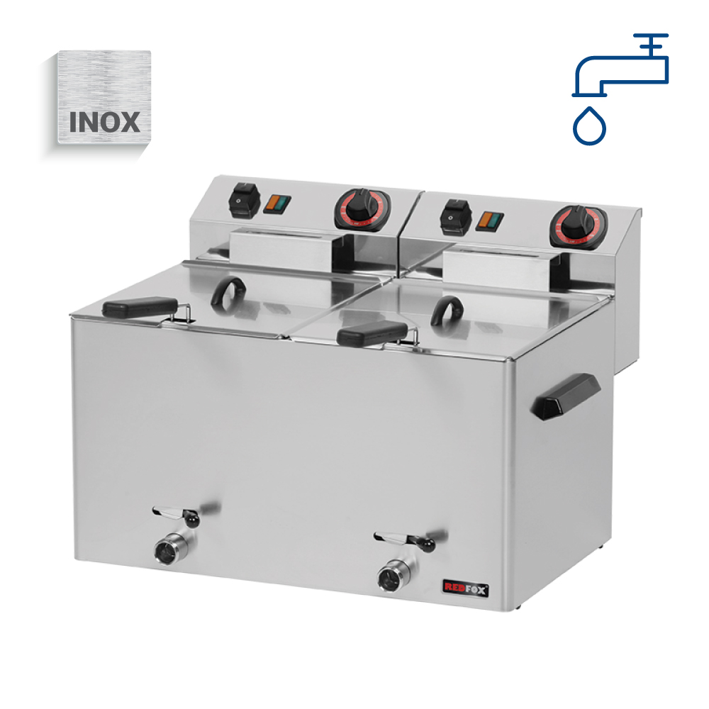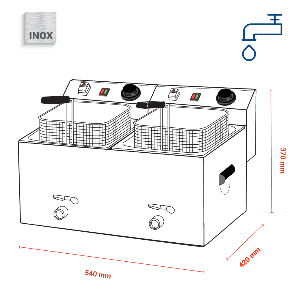 Διαστάσεις 540x420x370(h)mm Καλάθι 210x235x100(h)mm Χωρητικότητα βάσκας 2 x 8 lt Θερμοκρασία 50 - 190οC Αντίσταση 6 KWatt, 230V / 50Hz Κωδικός Προϊόντος 100 105 010 Σύστημα κρύας ζώνης Ανοξείδωτη αντίσταση Περιλαμβάνει 2 καλάθια